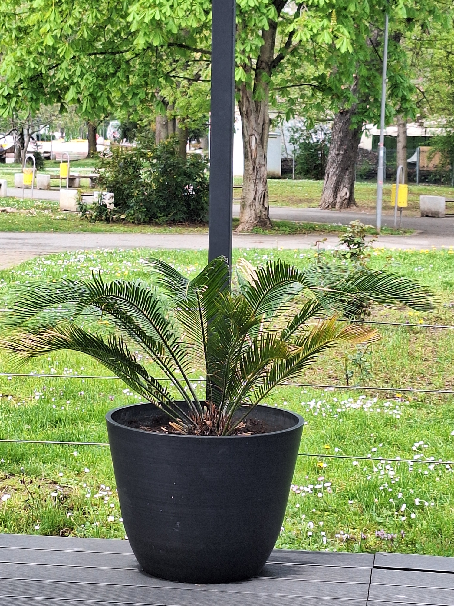 A potted Sago palm sits on a gray-toned deck against a backdrop of green lawn speckled with small white flowers. A pedestrian walkway runs parallel to the lawn, adjacent to a park area containing benc…read more