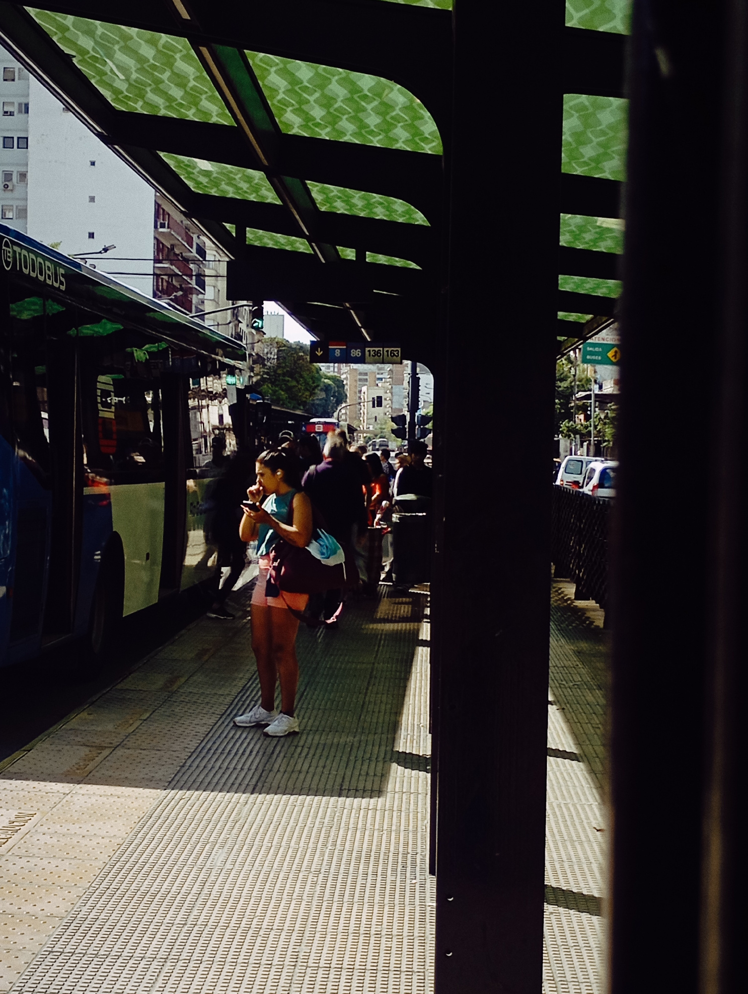 An outdoor scene depicts a bus stop platform in Buenos Aires, Argentina. People are waiting for a bus, the Todo Bus is visible on the left side of the image. A woman wearing a blue shirt and pink shor…read more