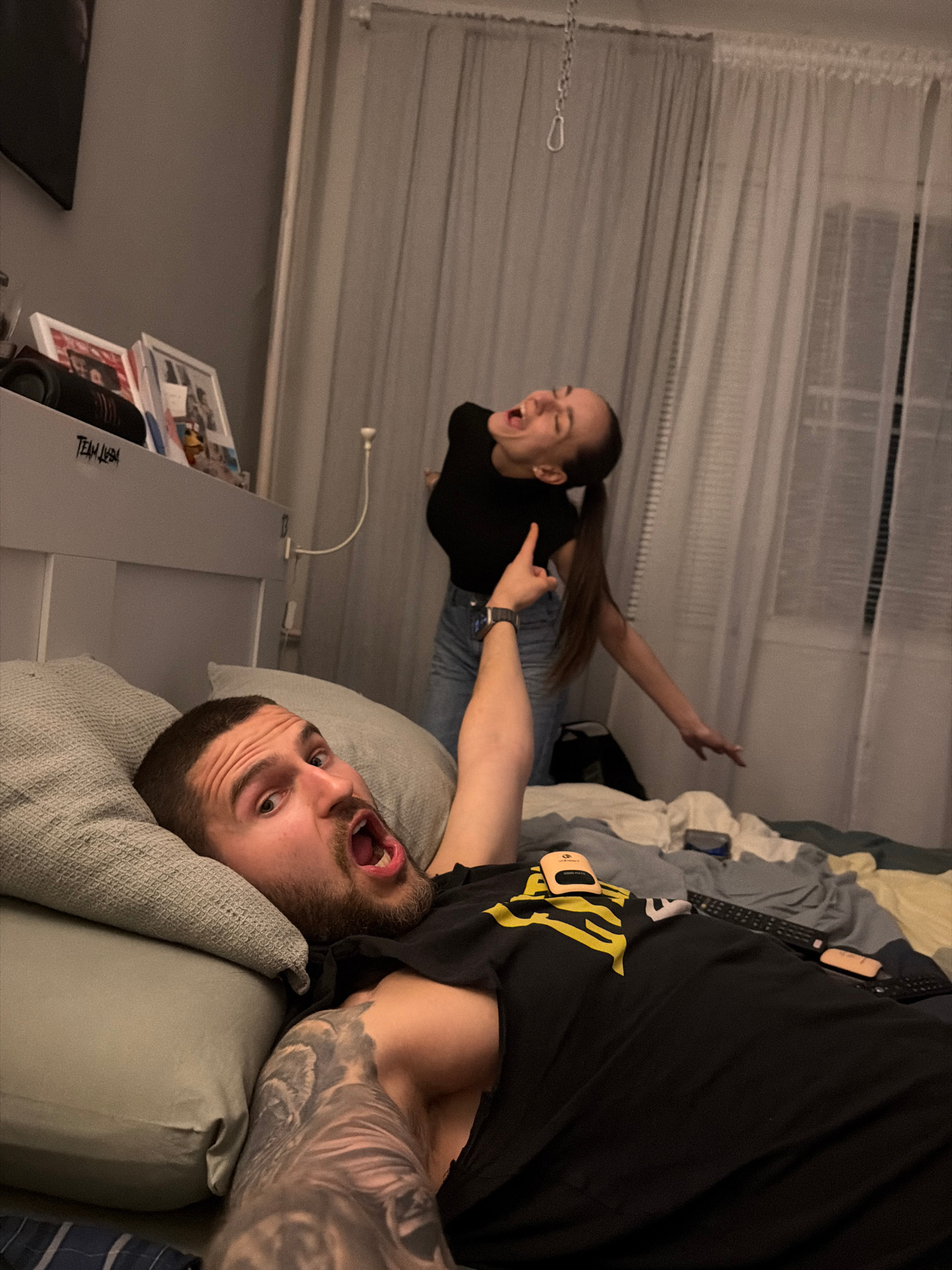 This indoor photograph, taken in Sofia, Bulgaria, captures two individuals in a playful and animated moment, likely in a bedroom or living room during the evening or night, indicated by the dim, ambie…read more