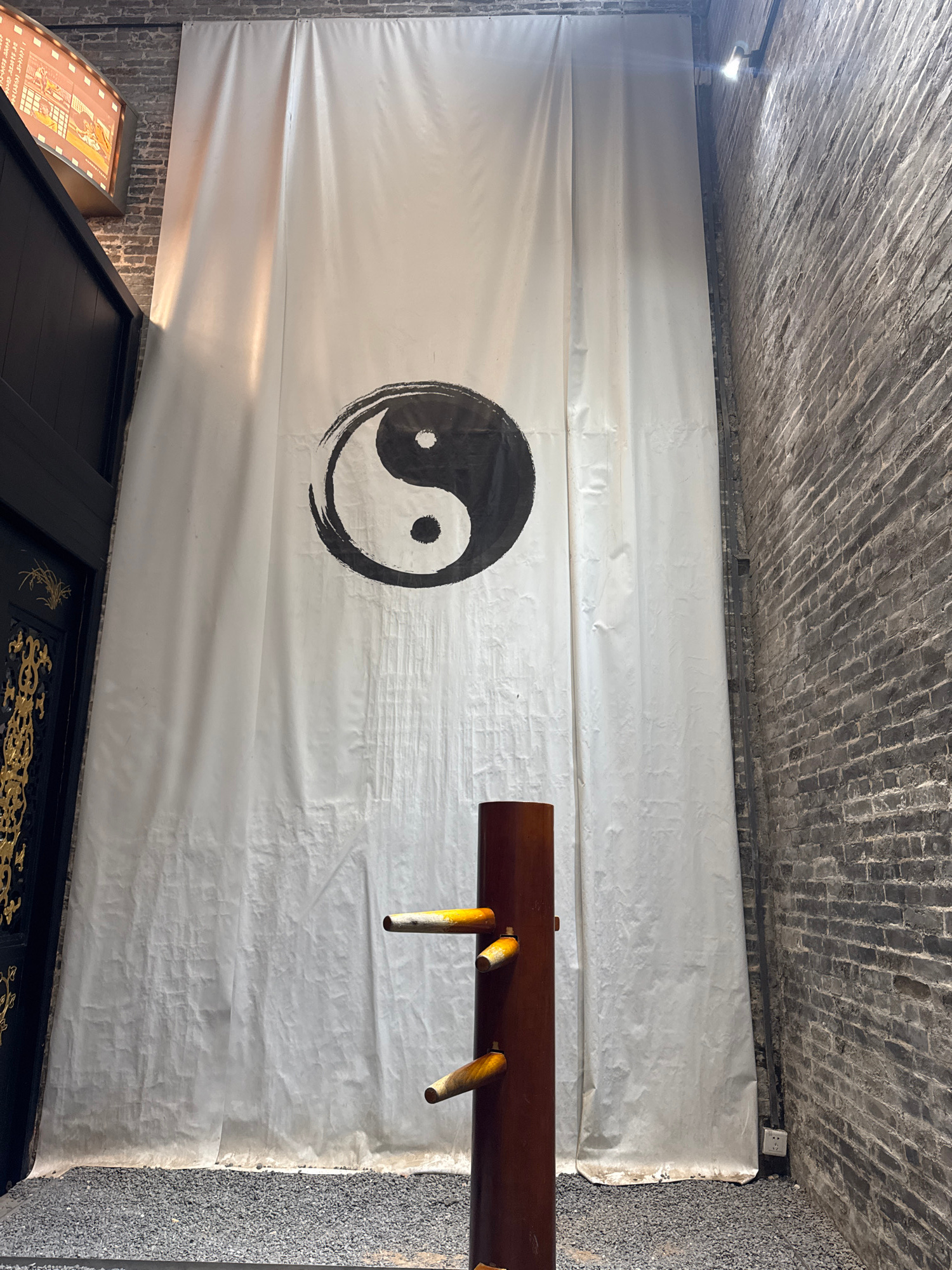 The image captures an indoor scene in the Liwan District, China. A white cloth hanging on the wall features a large yin-yang symbol. To the right, a wooden Wing Chun dummy is partially visible. Below,…read more