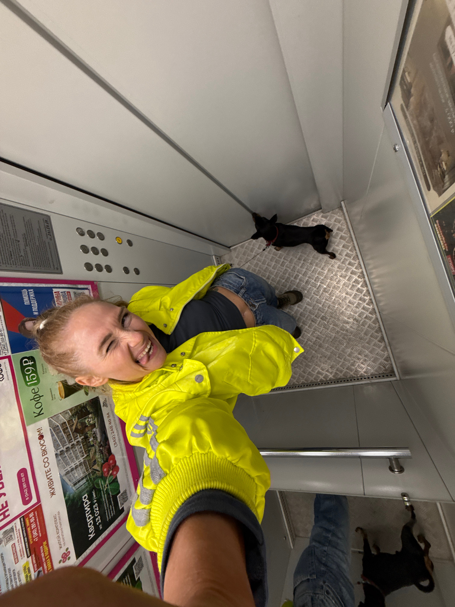 Here is a concise description of the image: The image appears to be a selfie taken by a woman in an elevator. She is wearing a bright yellow jacket and blue jeans. A small black dog with a red collar…read more
