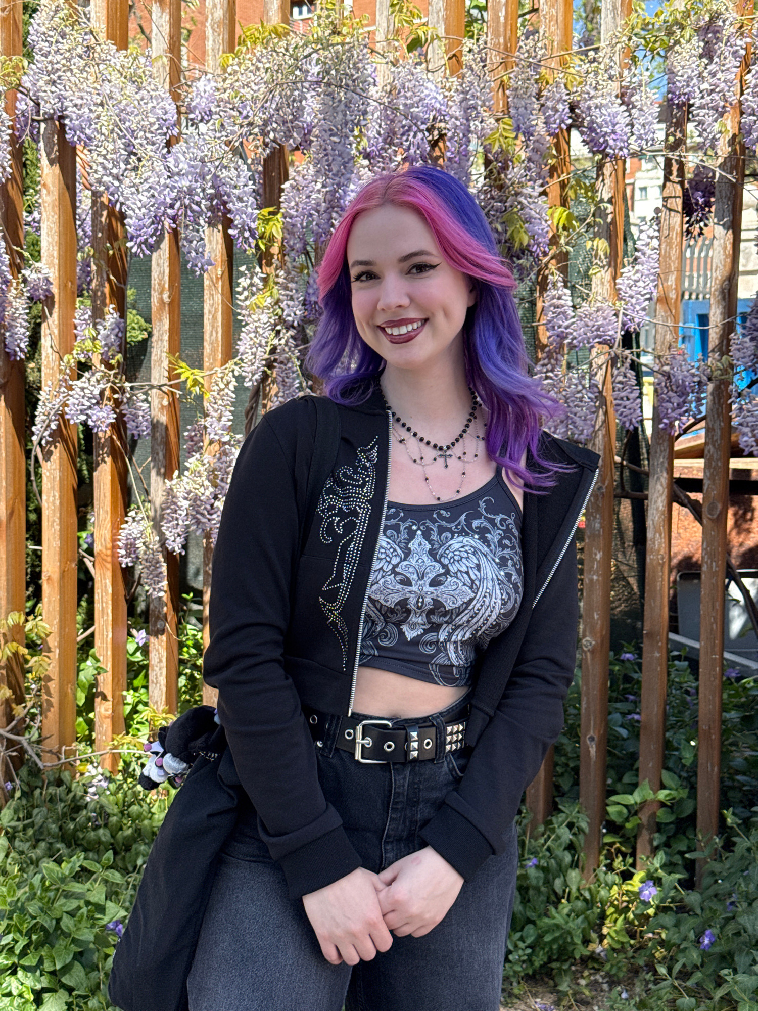 A young woman with dyed purple and pink hair stands smiling in front of a wooden trellis covered in wisteria flowers and some green foliage. She wears a black zip-up jacket with silver embellishments,…read more