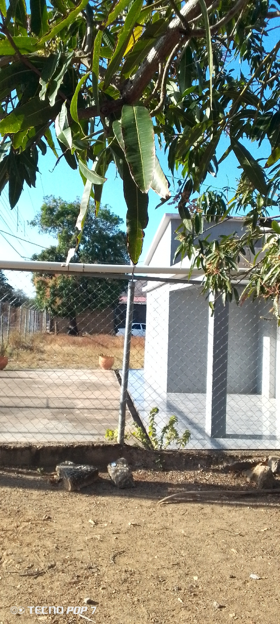 The scene is an outdoor area with a dirt ground in Altagracia, Venezuela. A chain-link fence separates the foreground from a background area that includes sparse grass, a few trees, and a white buildi…read more
