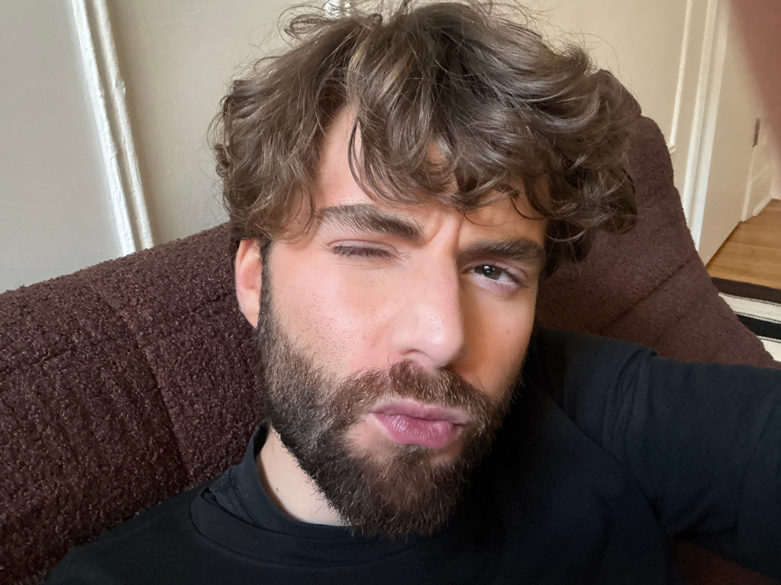 A man with curly brown hair and a beard is reclining on a brown textured surface, possibly a couch or cushion. He is wearing a black long-sleeved shirt. His face is partially obscured by his hair. He…read more