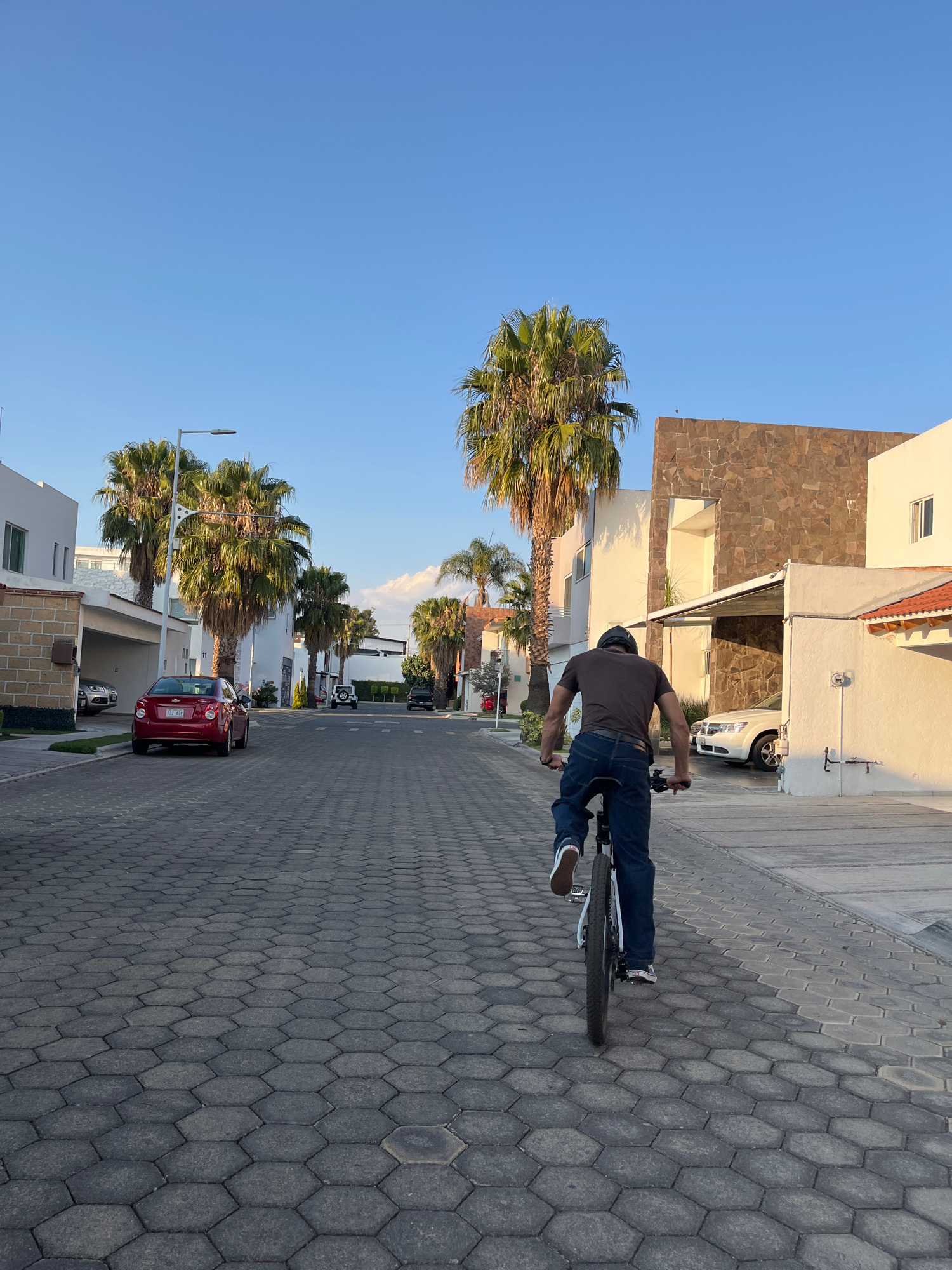 A man is riding a bicycle on a street paved with hexagonal blocks in San Andrés Cholula, Mexico. The rider wears a dark t-shirt, jeans, a helmet, and sneakers. The street is lined with palm trees and…read more