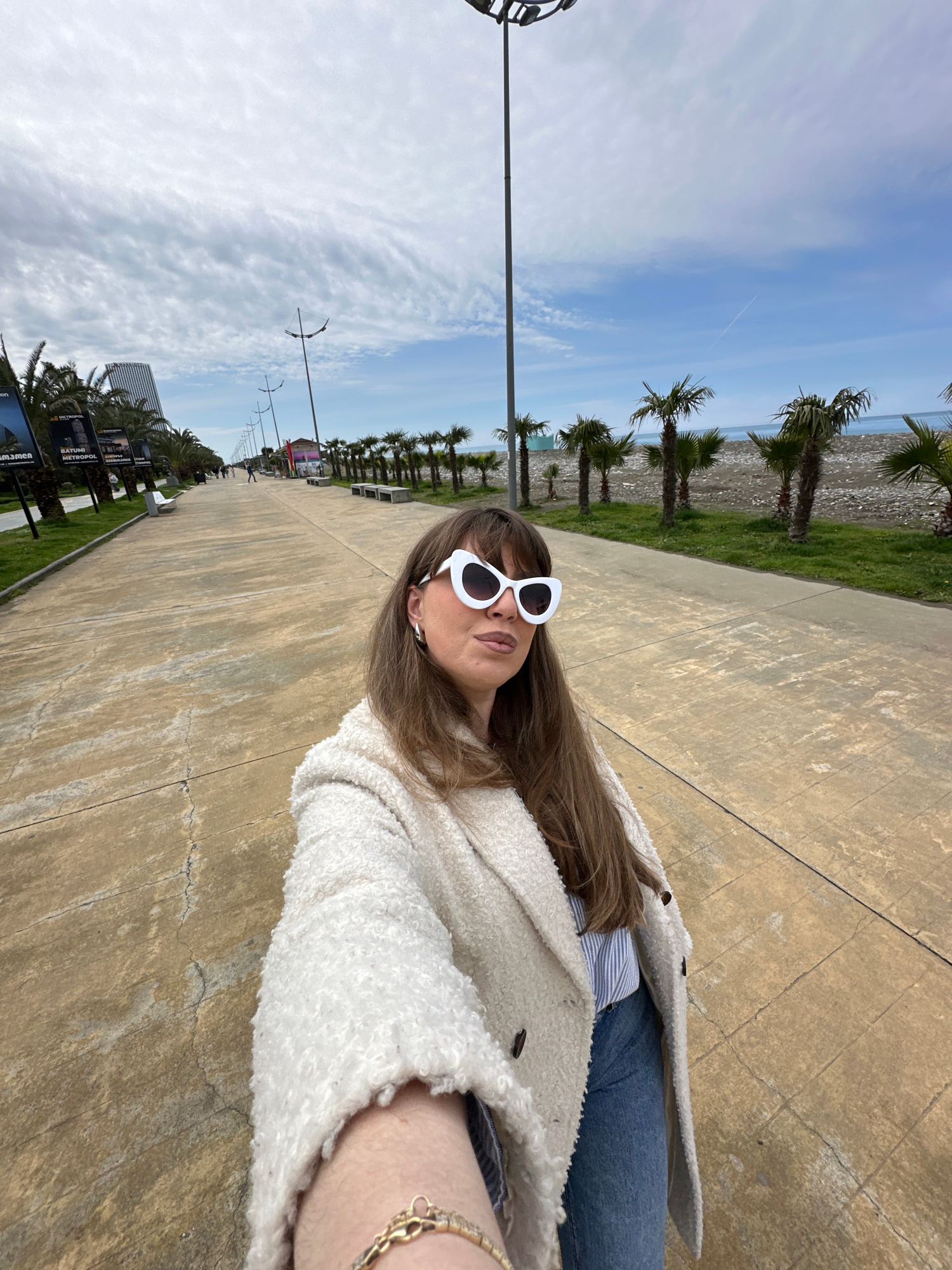 A medium shot, slightly angled, shows a woman wearing white-rimmed sunglasses and a white, textured coat, seated on a concrete surface. She is facing the camera. The background reveals a promenade lin…read more