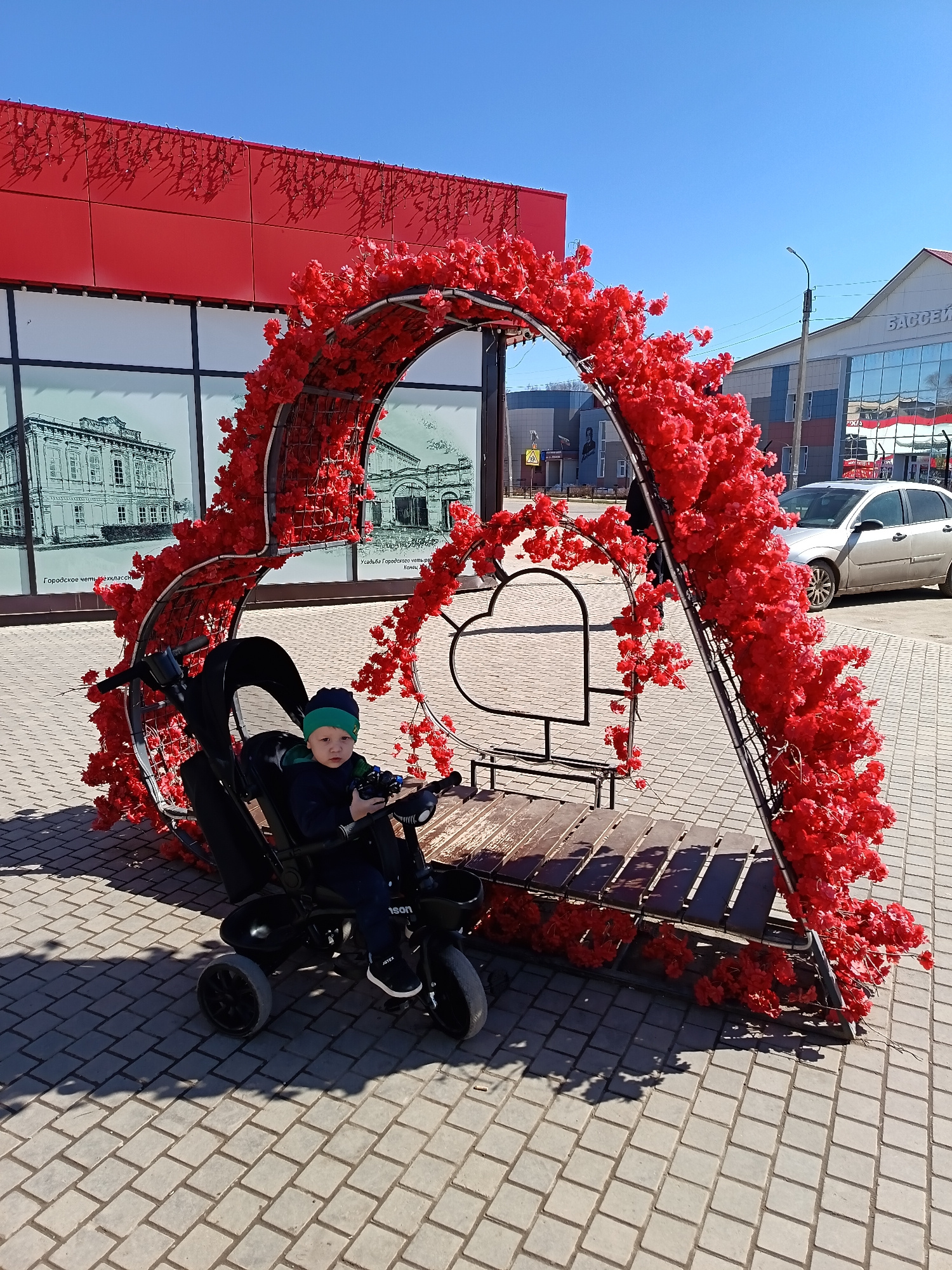 A young child sits in a black stroller-tricycle positioned in front of a large, heart-shaped metal structure adorned with red flowers, likely artificial. The heart structure features a built-in wooden…read more