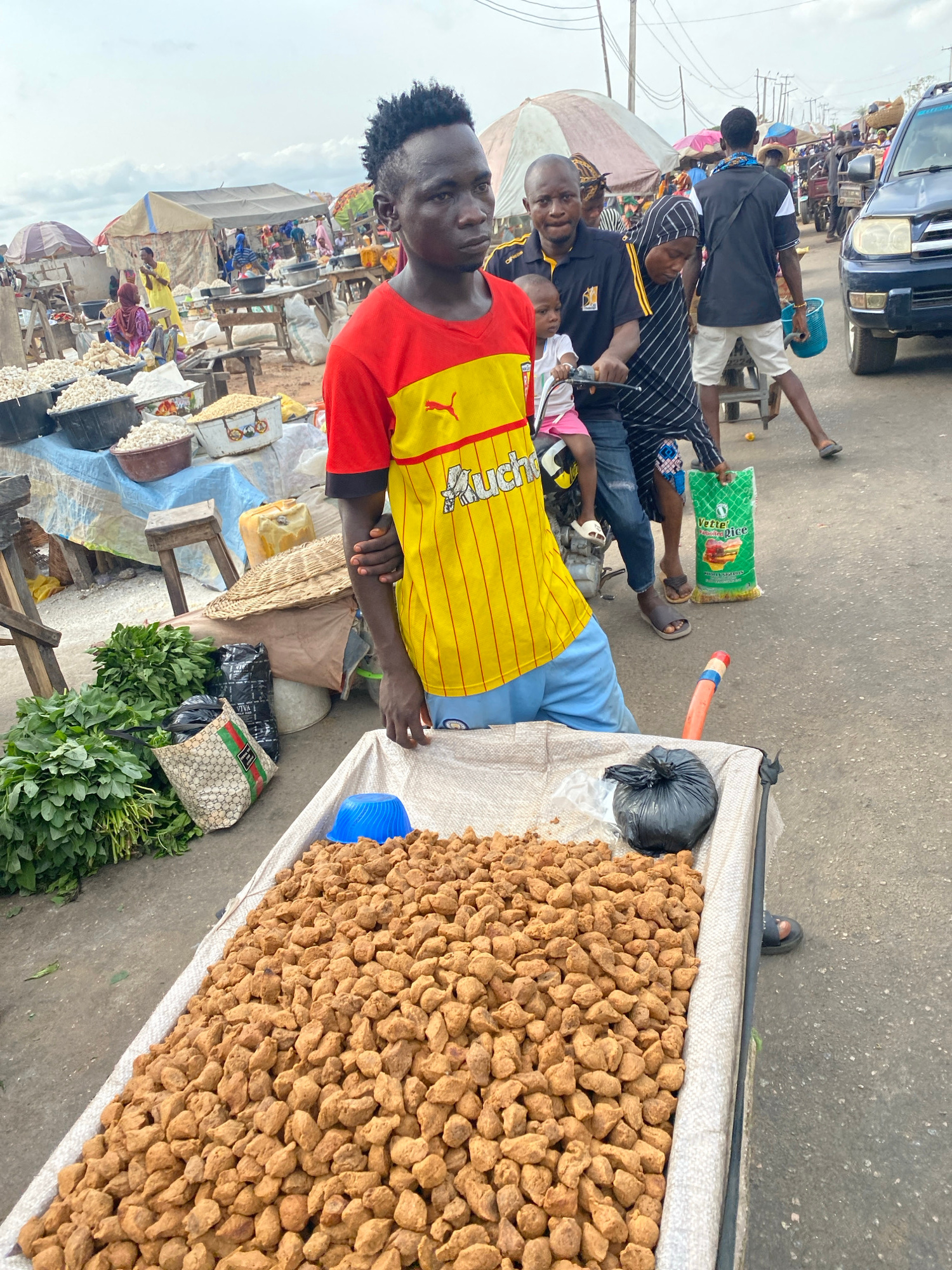 The scene depicts a bustling marketplace in Lokoja, Nigeria. A man in a red and yellow soccer jersey stands by a cart filled with what appear to be small, brown, pebble-sized food items, possibly grou…read more
