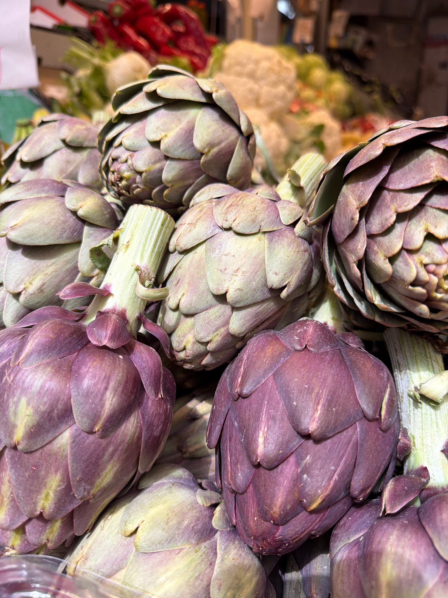 A close-up, high-angle shot displays a cluster of artichokes. The artichokes vary in color, ranging from green to purple hues. In the background, there are other vegetables, including what appears to…read more