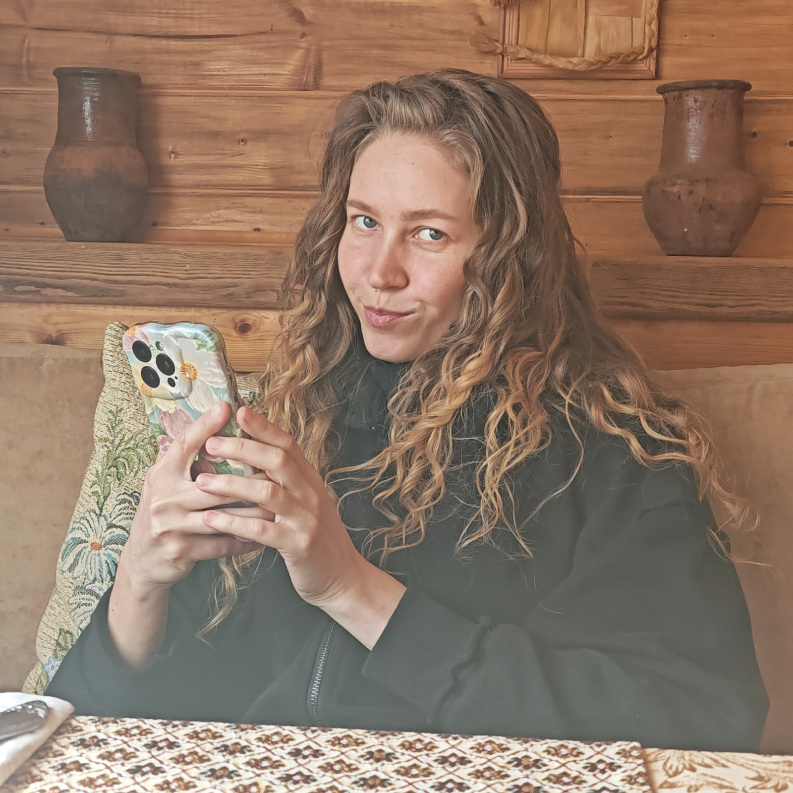 A young woman with long, wavy hair is seated at a table in what appears to be a rustic restaurant or dining area. The location is Rostov, Russia. She is holding a smartphone with a floral design case.…read more