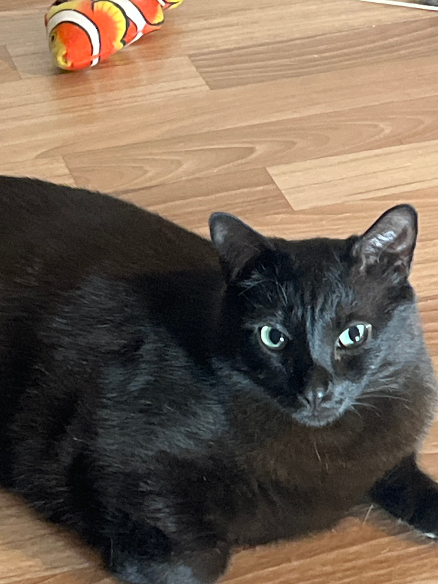 A black cat is lying on a wood-patterned floor next to a clownfish-patterned toy. The cat is looking up at the camera with its head cocked to the side. The environment indicates a domestic indoor sett…read more