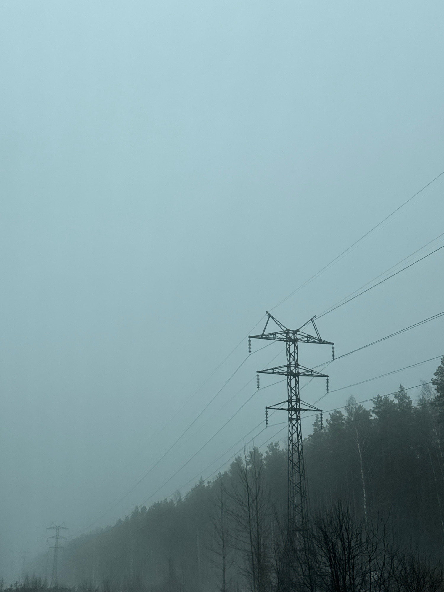 The image depicts an overcast scene of power lines and towers traversing a forest area, possibly in Novyi, Russia. The sky is a uniform pale blue, indicating a heavy layer of cloud cover or fog. A metβ¦read more