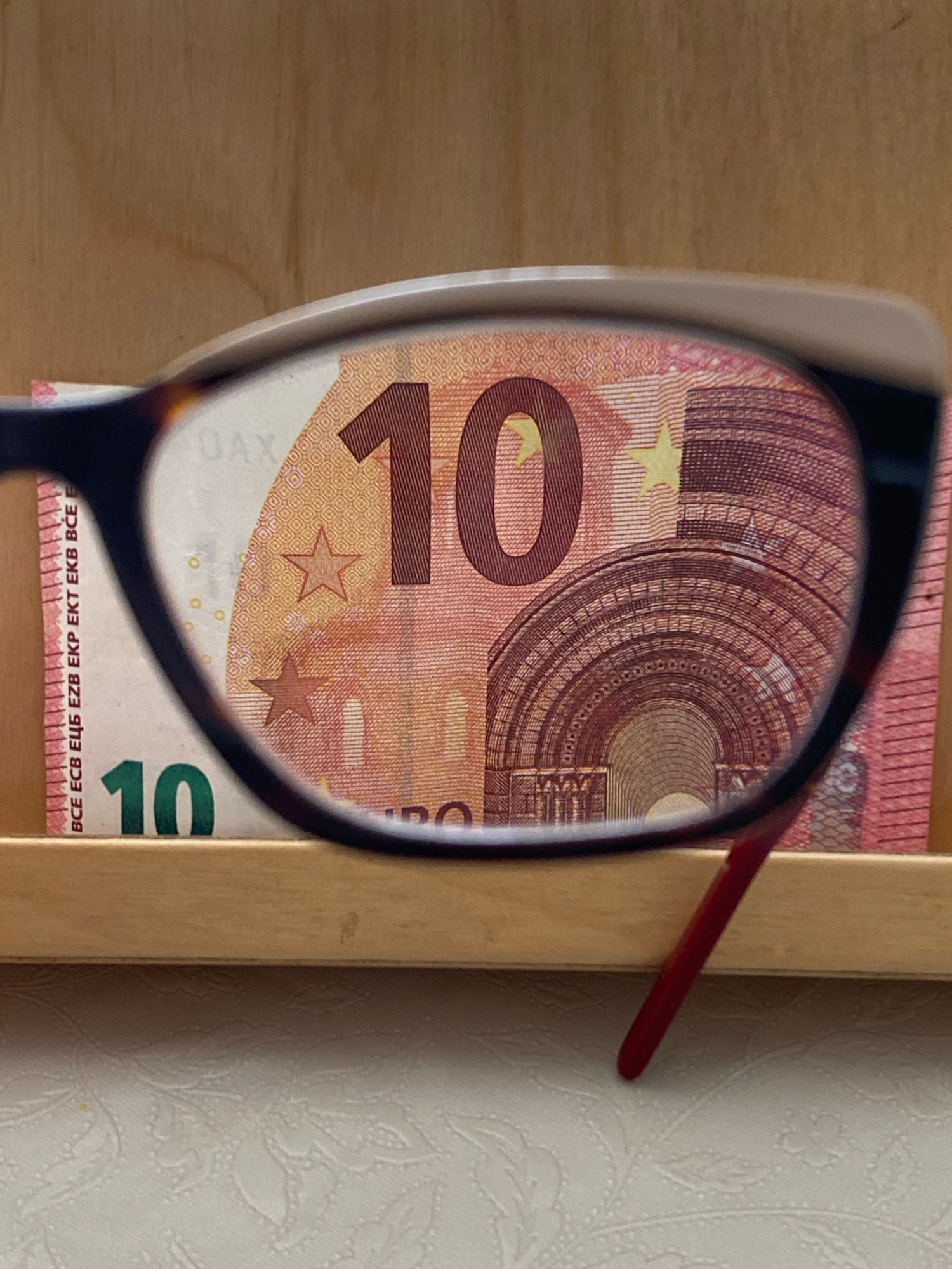 A close-up captures a 10 Euro banknote viewed through a pair of glasses. The bill is positioned in front of a wooden surface, possibly a frame, with a portion of a red object (possibly the temple arm…read more