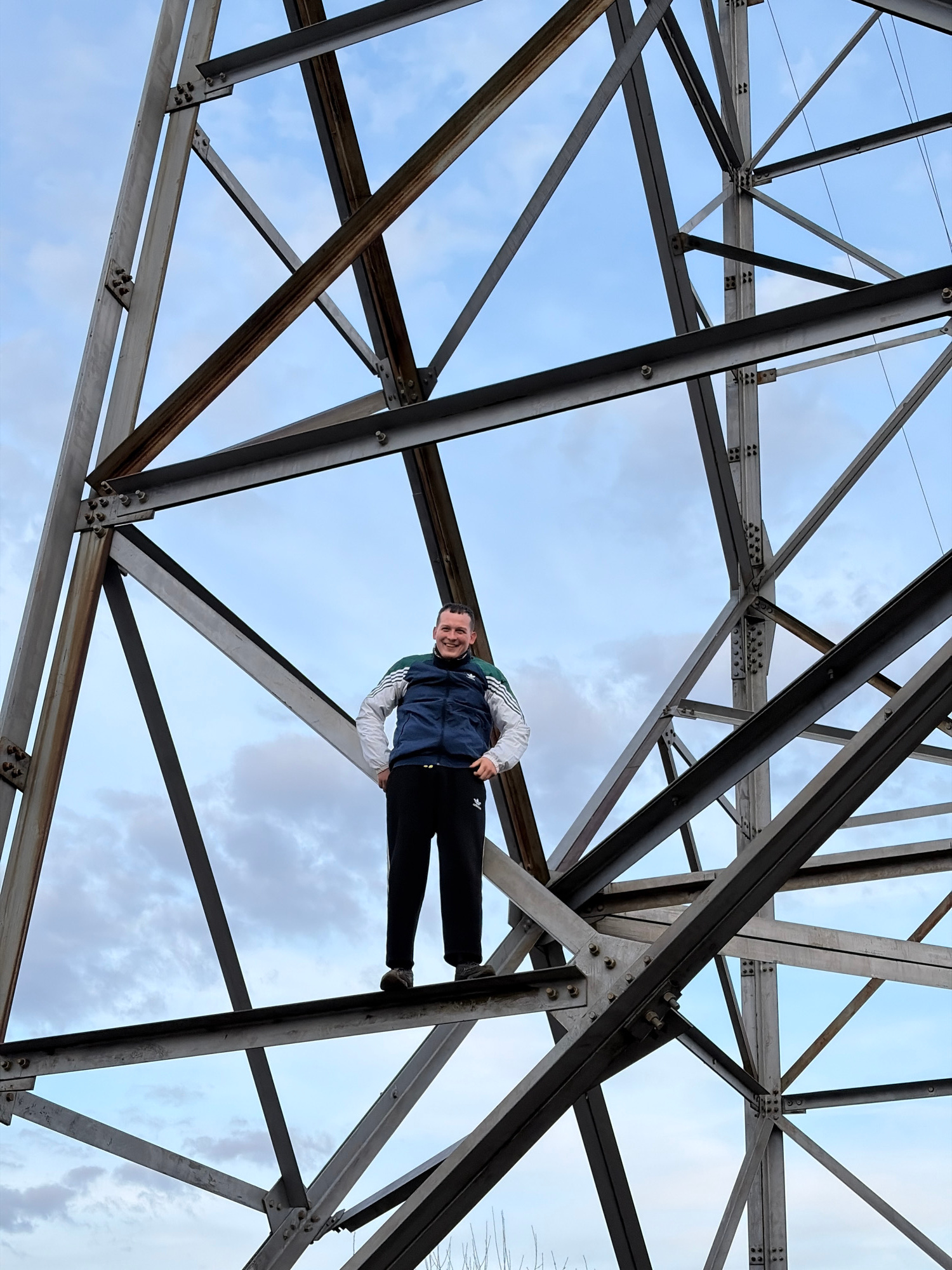 A medium shot of a man perched on the structural steel framework of a power transmission tower. He is wearing black pants and a navy blue tracksuit jacket with white stripes on the sleeves. He looks t…read more