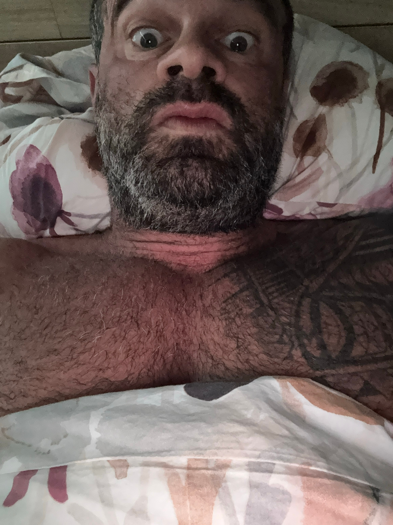 A man with a salt-and-pepper beard and wide eyes is lying in bed. He is positioned on his side, facing the camera, with a floral-patterned pillow behind his head and a patterned blanket partially cove…read more