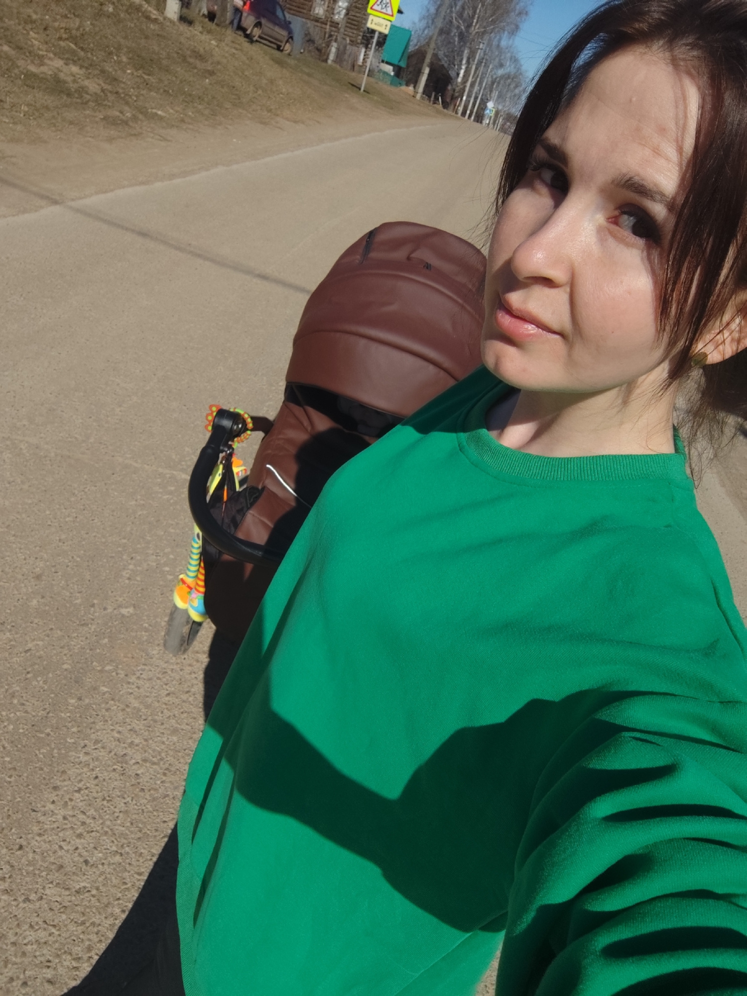 The image is a selfie of a woman and a baby stroller on a sunny day in what appears to be a rural or semi-rural setting in Фоки, Russia. The main subject is a woman with dark hair, looking towards the…read more
