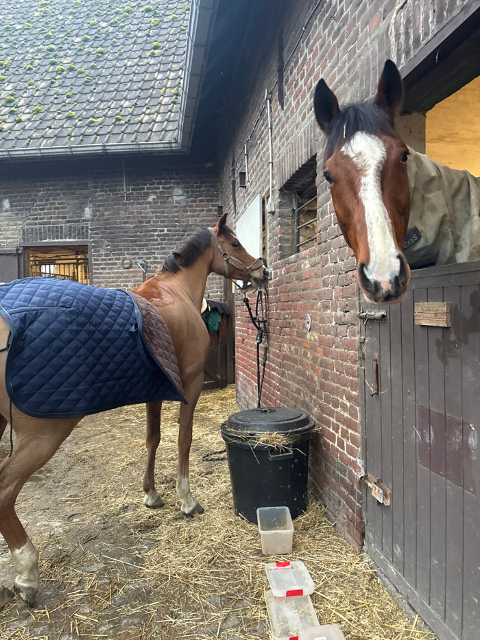 This image depicts an outdoor stable yard at a facility in Estaimpuis, Belgium. Two horses are present. On the right side of the frame, a chestnut horse with a prominent white blaze and dark mane is s…read more