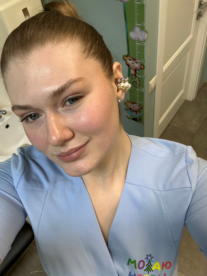A fair-skinned person with light blue eyes and light brown hair pulled back in a bun is depicted at a close-up angle. The person is wearing elaborate pearl and gold earrings and a light blue top with…read more