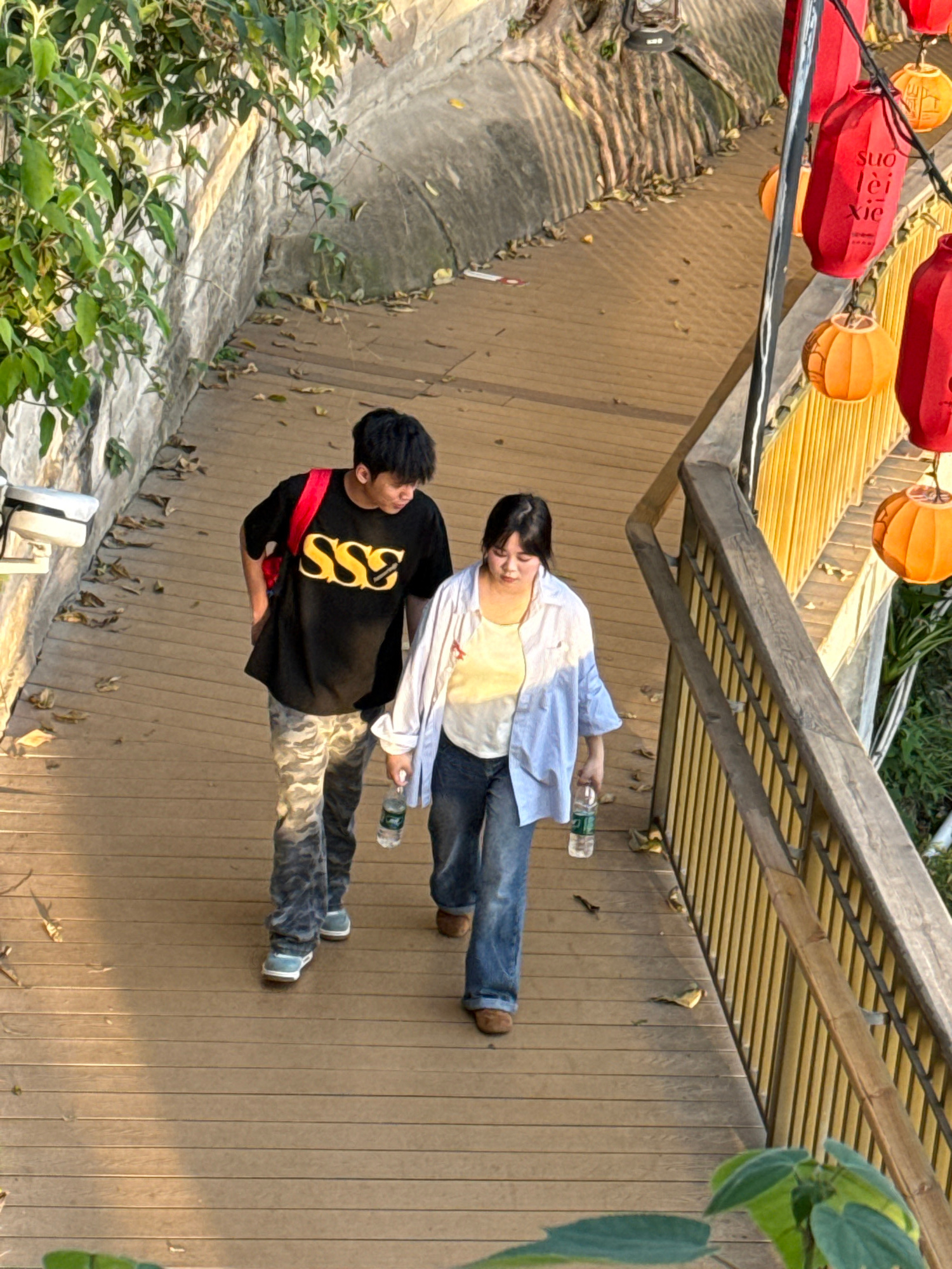 Observed outdoors in Yuzhong District, China, on a wooden boardwalk under red and orange lanterns, a woman in a yellow top, blue jeans, and a blue and white striped button-down shirt holds a water bot…read more