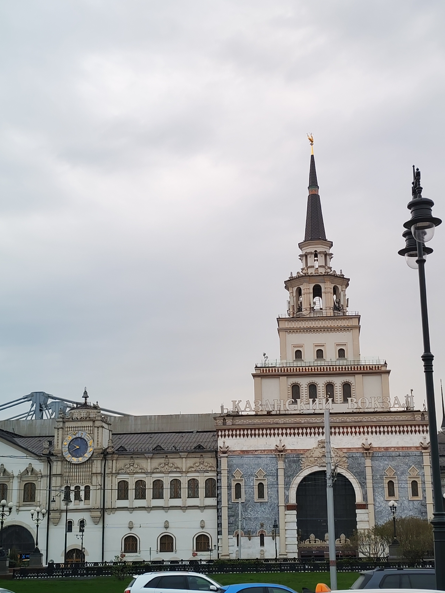 The image displays the grand architectural facade of Kazan Station in Moscow, Russia, under an overcast sky. The prominent building features a tall, slender spire on the right, capped with a distincti…read more