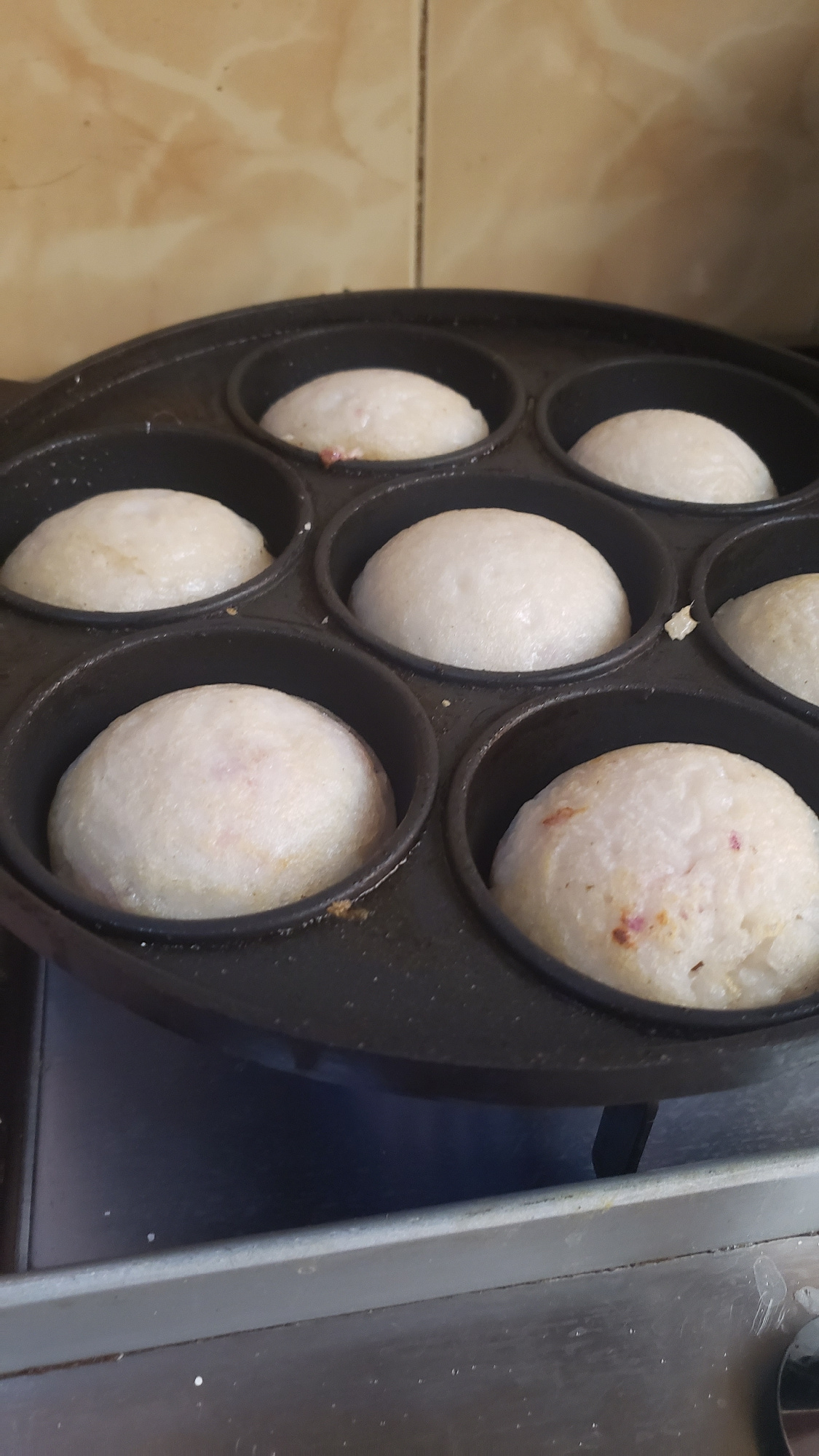 The image displays a close-up, slightly overhead view of a black, multi-mould cast-iron pan actively used for cooking. Seven round, light-colored food items, appearing to be mini-pancakes or spherical…read more