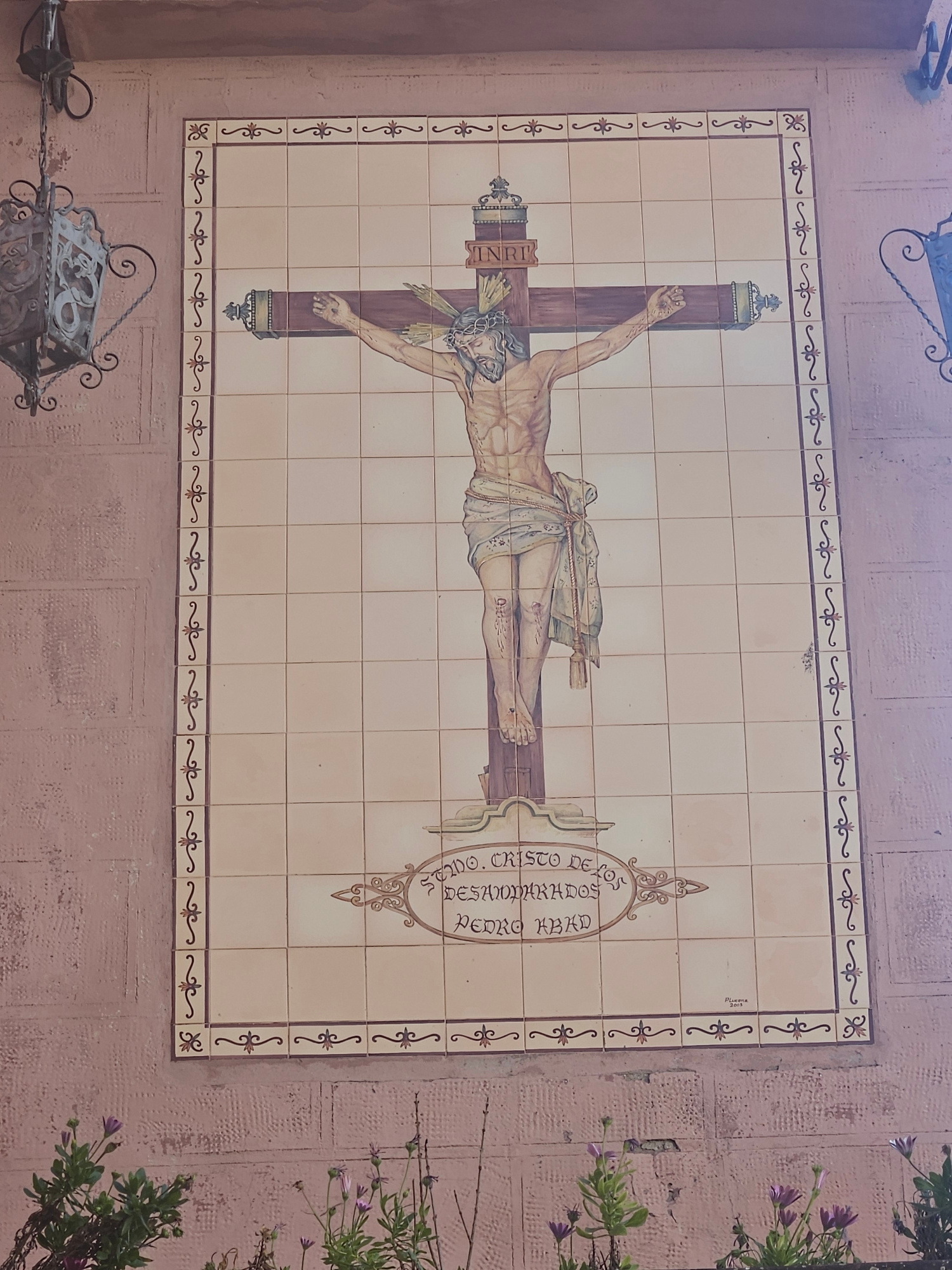 A high-angle shot depicts a ceramic tile mural affixed to a salmon-pink textured wall. The mural depicts the crucified Christ, lying horizontally on a cross. The cross has INRI written in dark letteri…read more