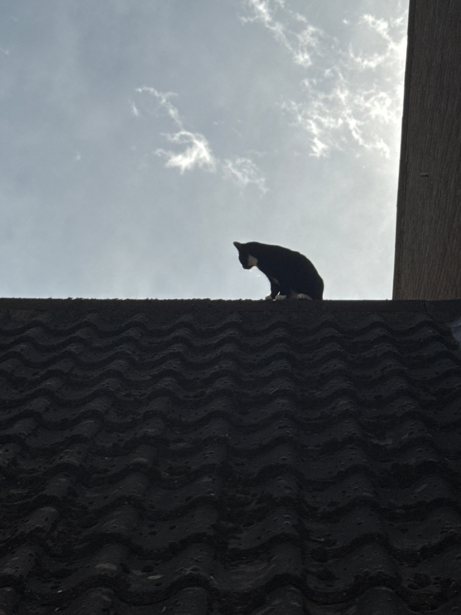 A low-angle shot looking up at a black bird clinging to the side of a dark, textured structure. The bird is positioned near the center of the image, appearing small and dark against the brighter sky.…read more