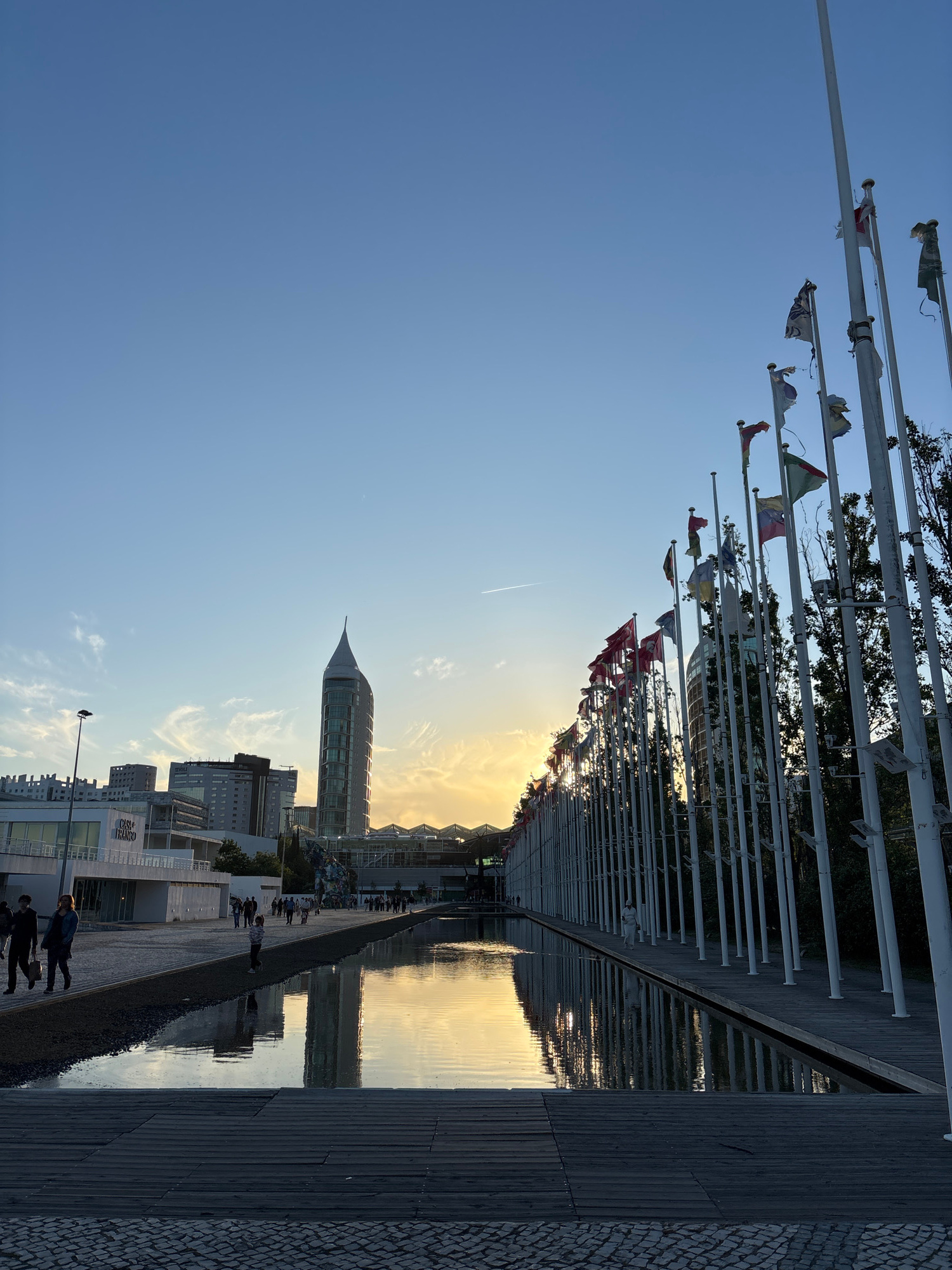 The image depicts a waterfront scene in Lisbon, Portugal, likely within or near the Parque das Nações area. A row of white flagpoles with tattered flags lines the upper portion of the frame. Below the…read more