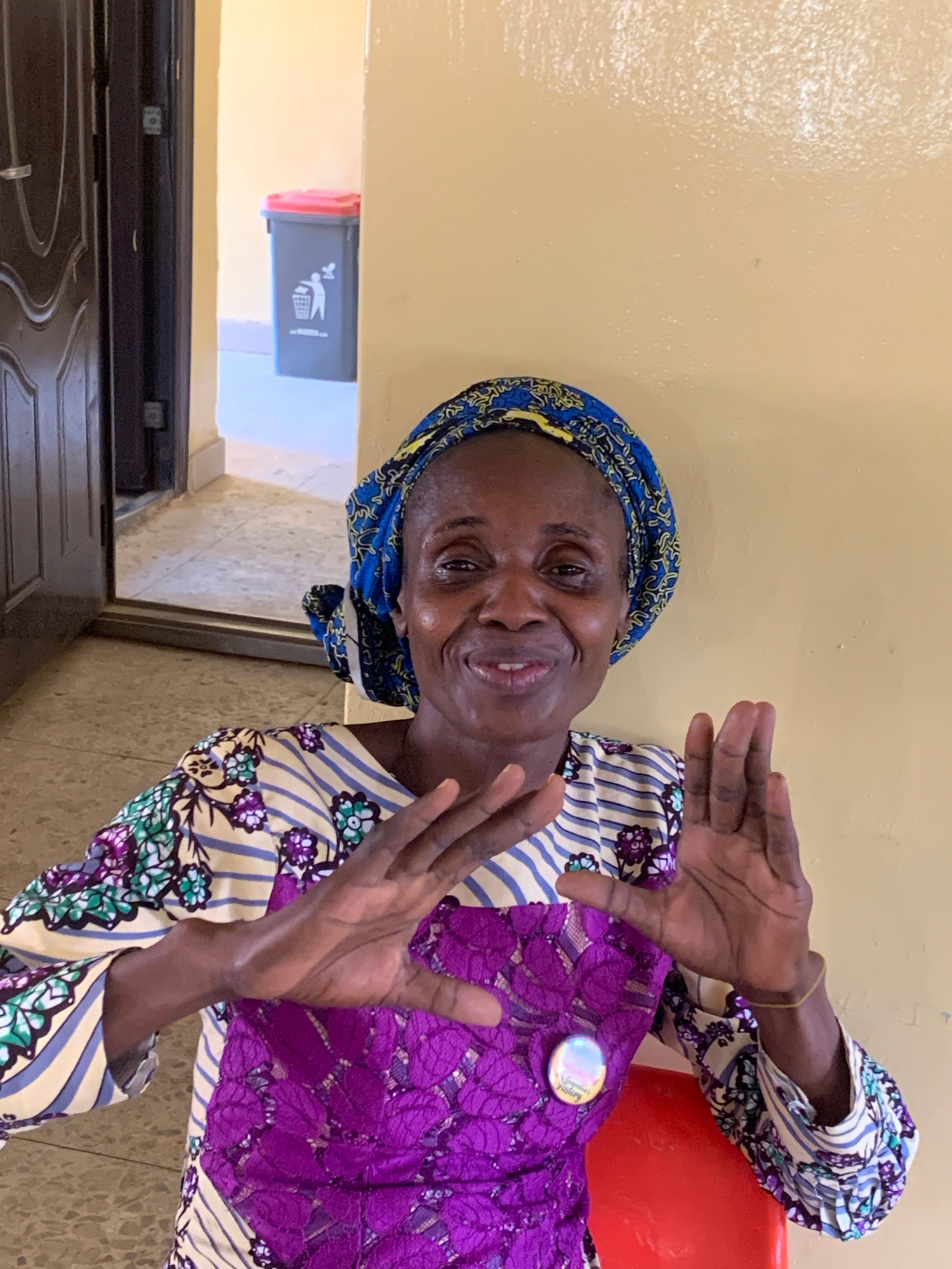 A medium shot depicts an older Black woman indoors, smiling and gesturing with her hands. She is wearing a colorful patterned headscarf and a purple lace-over-striped-fabric dress with a button on the…read more