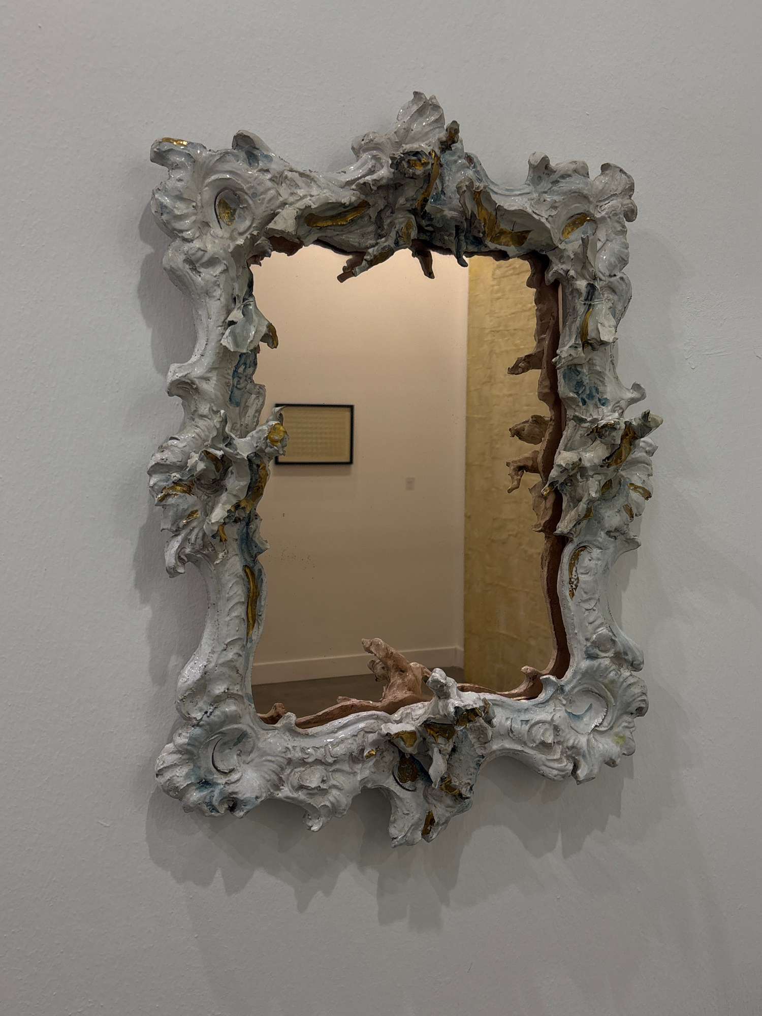 A heavily ornamented, rococo-style mirror hangs on a white wall. The frame of the mirror is painted in white, light blue and gold. The mirror reflects a room interior, including an adjacent wall paint…read more
