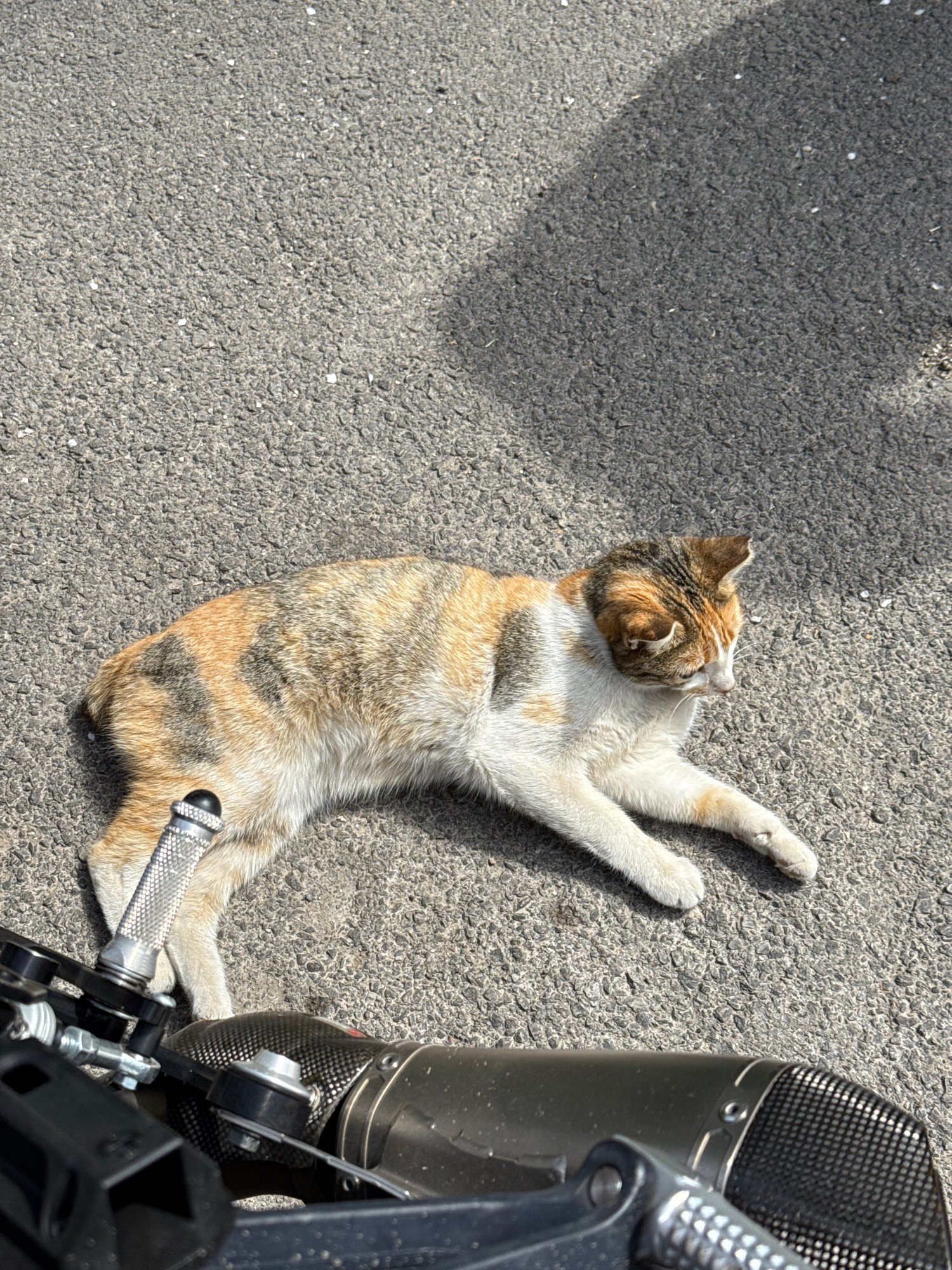 A tan, white, and brown cat lies on asphalt next to a motorcycle in Bozhurishte, Bulgaria. The cat's belly is visible and its paws are extended. The motorcycle's exhaust and footpeg are in the frame.…read more