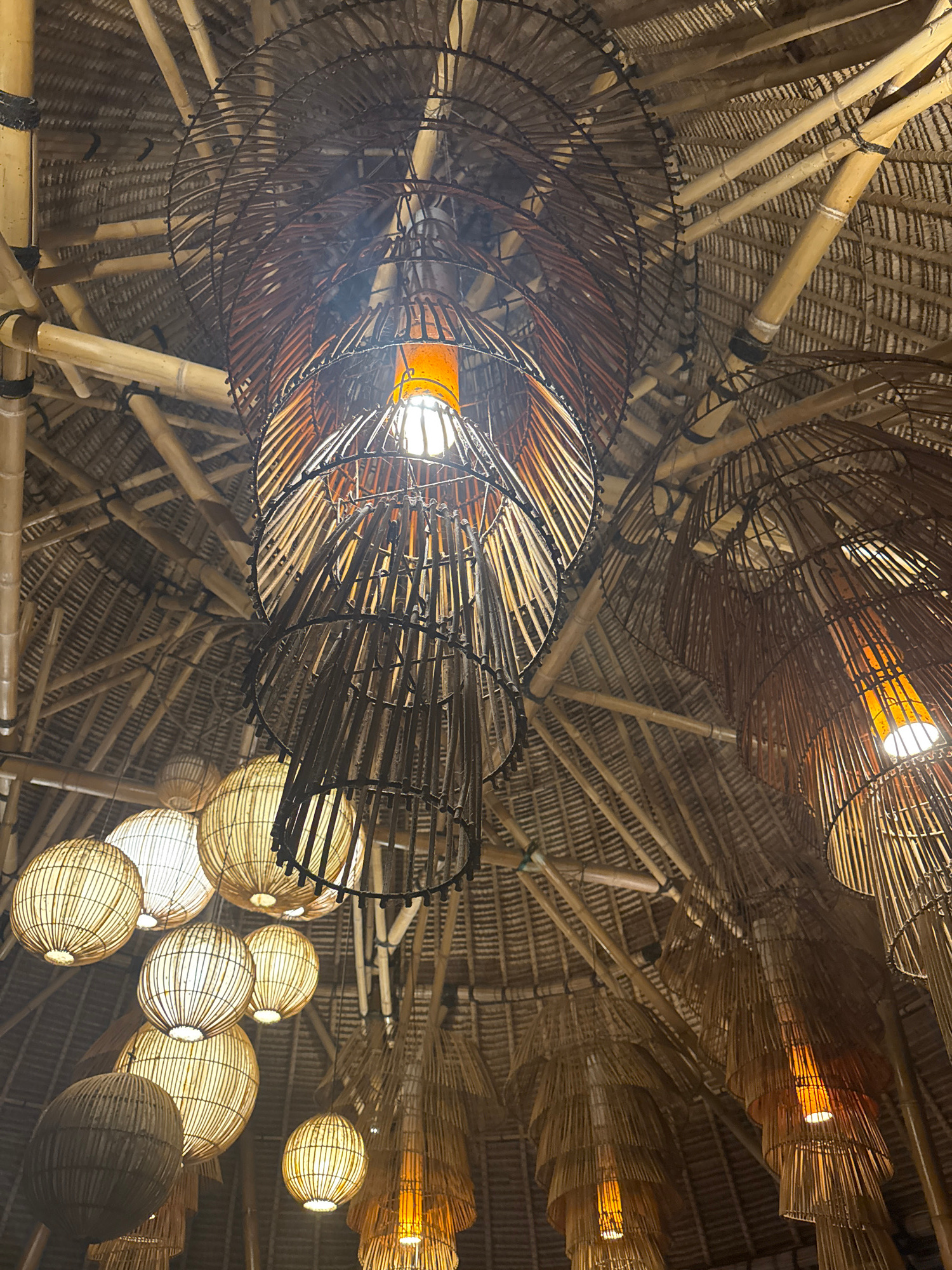 An upward-looking view captures the intricately designed ceiling of an indoor space, characteristic of tropical architecture, consistent with the Kuta Selatan, Indonesia, context. The ceiling structur…read more