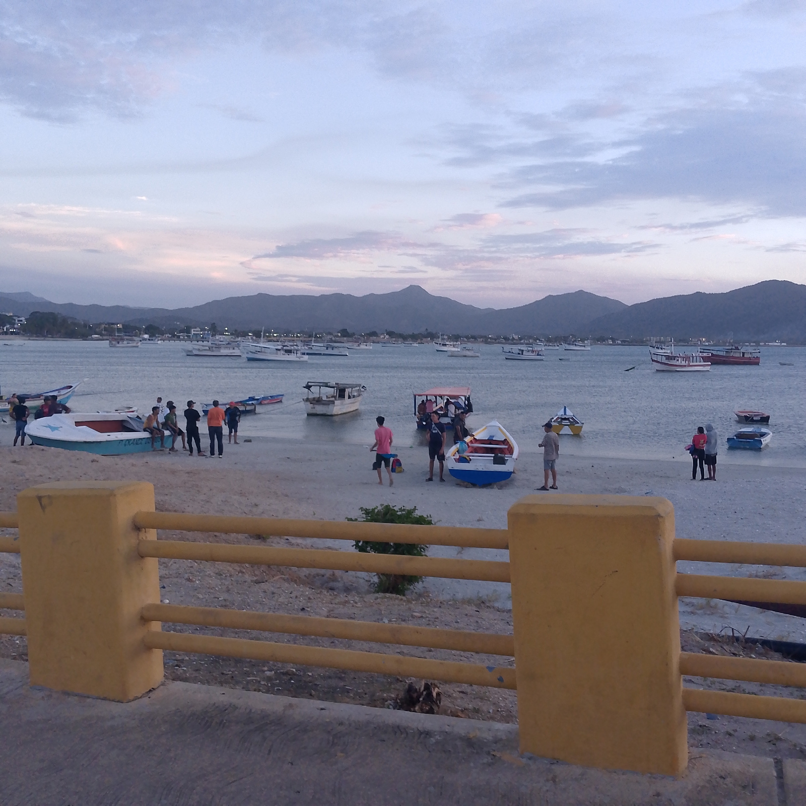 The image depicts a beach scene in Juan Griego, Venezuela, likely during the late afternoon or early evening based on the lighting conditions and position of the sun. In the foreground, a yellow concrβ¦read more