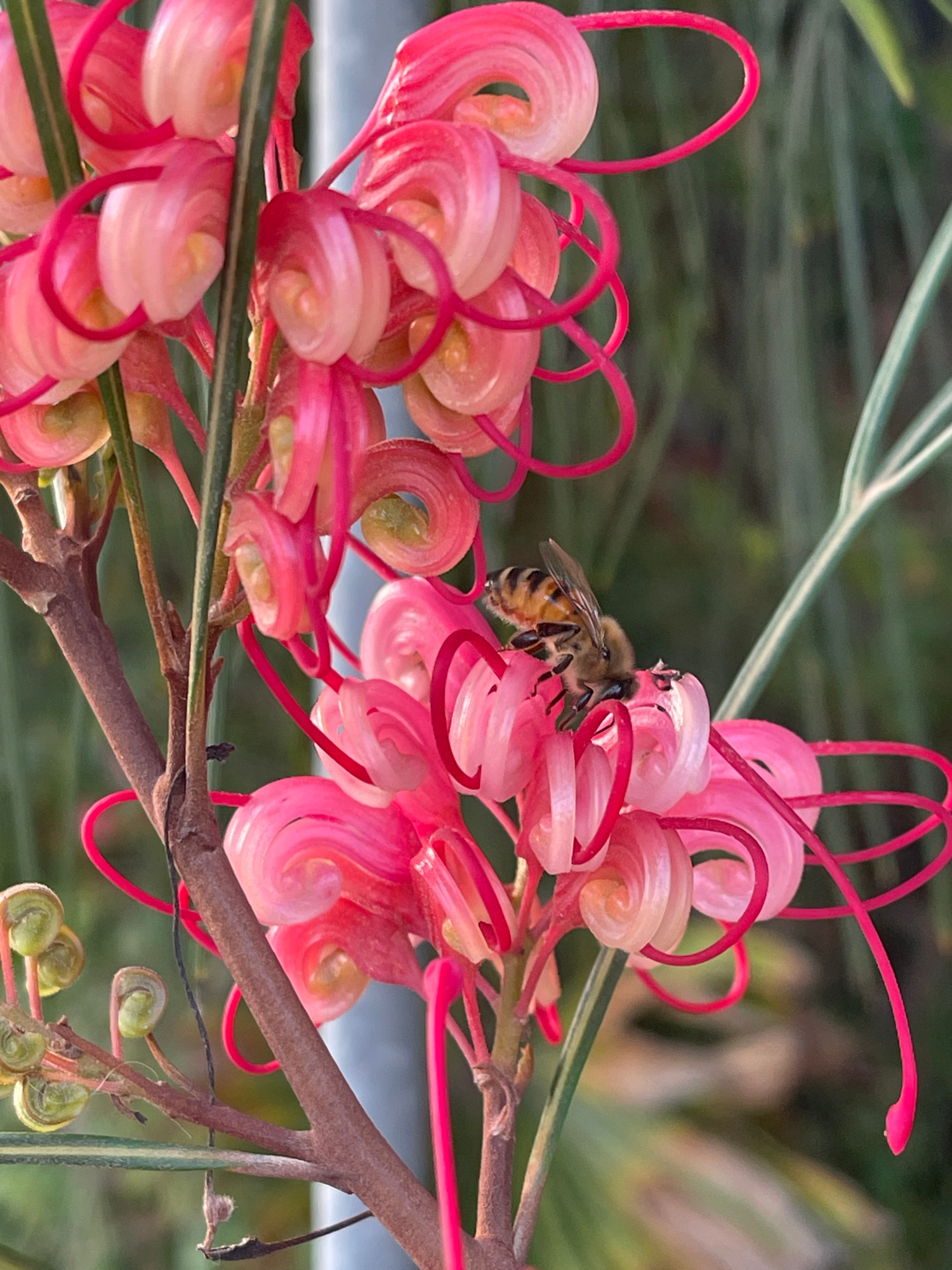 A bee is perched on a pink grevillea flower in Zikhron Yaakov, Israel. The bee has yellow and black stripes and appears to be collecting nectar. The flower is composed of tightly wound pink coils with…read more