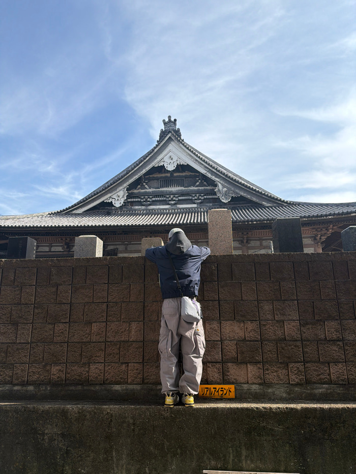 A person with a hooded jacket and baggy pants leans against a textured brown wall near a traditional Japanese building with an ornate roof against a partly cloudy sky. A yellow sign with Japanese writ…read more