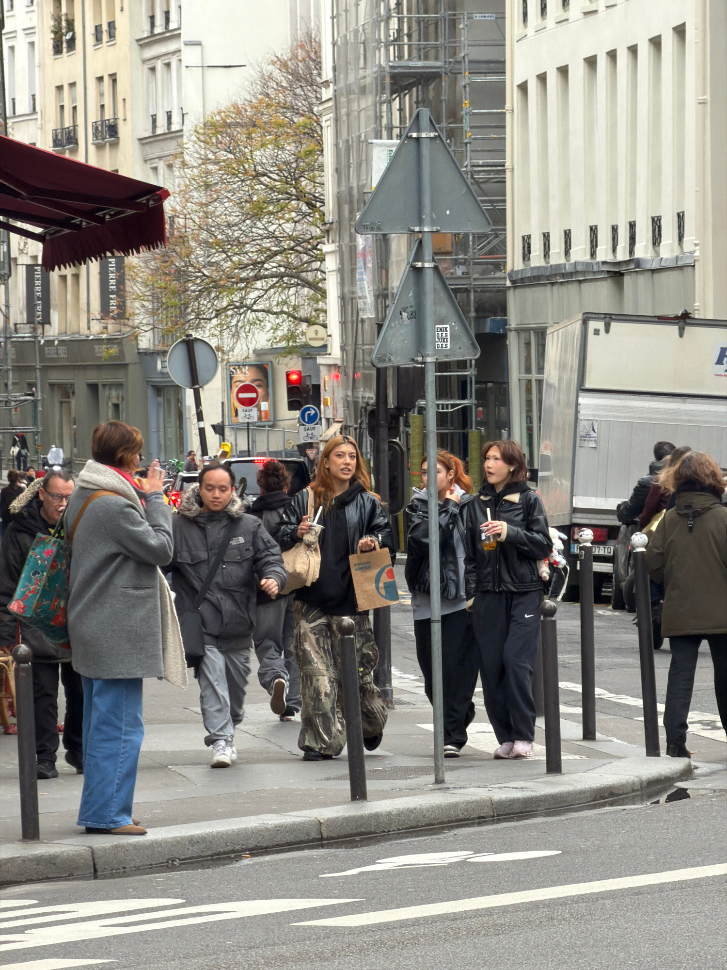 The image captures a street scene in Paris, France, on an overcast day. Pedestrians are visible on a grey sidewalk, with a paved road and white crosswalk markings in the foreground. In the immediate…read more