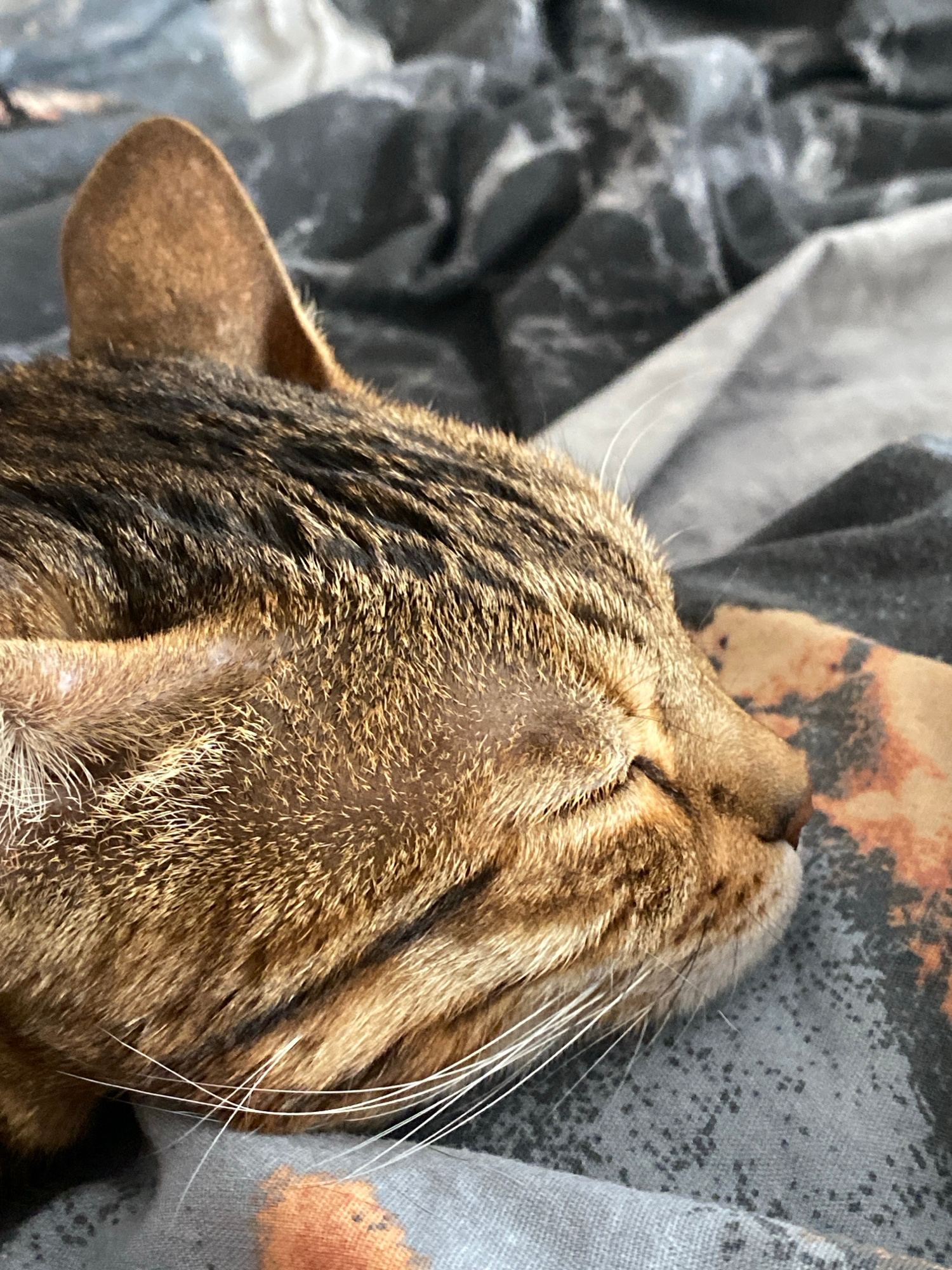 A close-up shot depicts the head of a tabby cat resting on patterned bedding. The cat's fur is a mix of brown and dark brown stripes. The cat's ear is visible on the left side of the image. Its whiske…read more