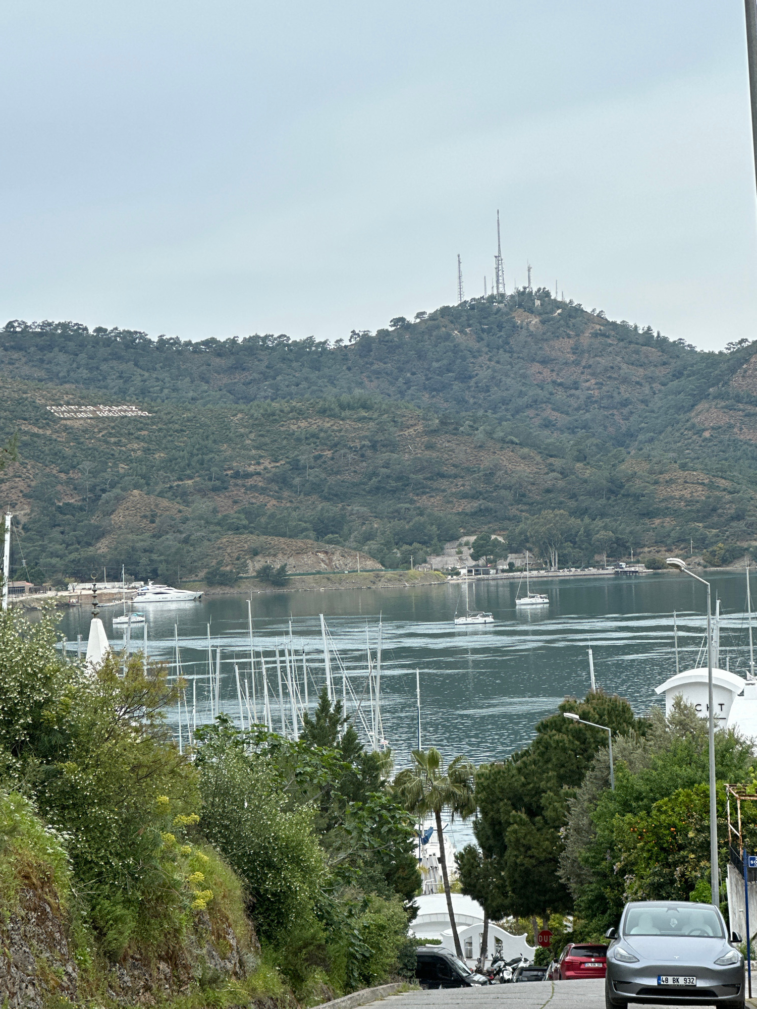 The image shows a marina in Fethiye, Turkey, taken from an elevated perspective. On the right side of the frame is a sidewalk bordering the marina, with lush green foliage in the foreground and a park…read more