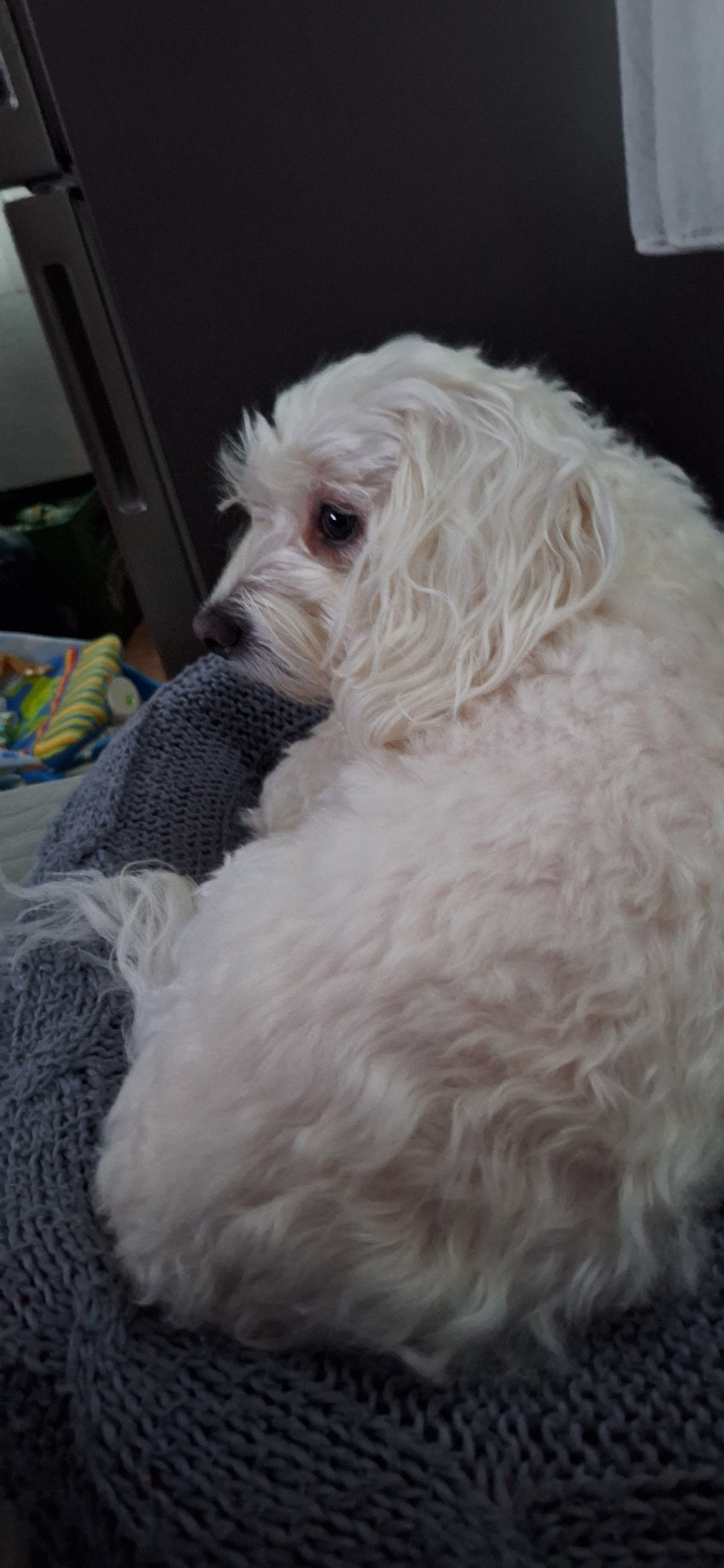 A small, white, fluffy dog is resting on a gray knitted blanket. The dog is lying down, facing left, with its head tilted downward. Part of a black surface is visible behind the dog. The location is n…read more