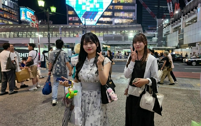 The image depicts an urban night scene in Shibuya, Japan, characterized by artificial illumination from streetlights and building displays. In the foreground, two East Asian females stand, posing for…read more