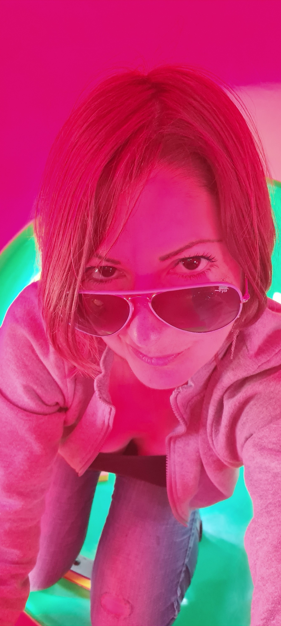 The image shows a person with dyed red hair and sunglasses, wearing a pink hoodie and jeans. The person is positioned against a background of pink and green. The location is Lachish Regional Council,…read more