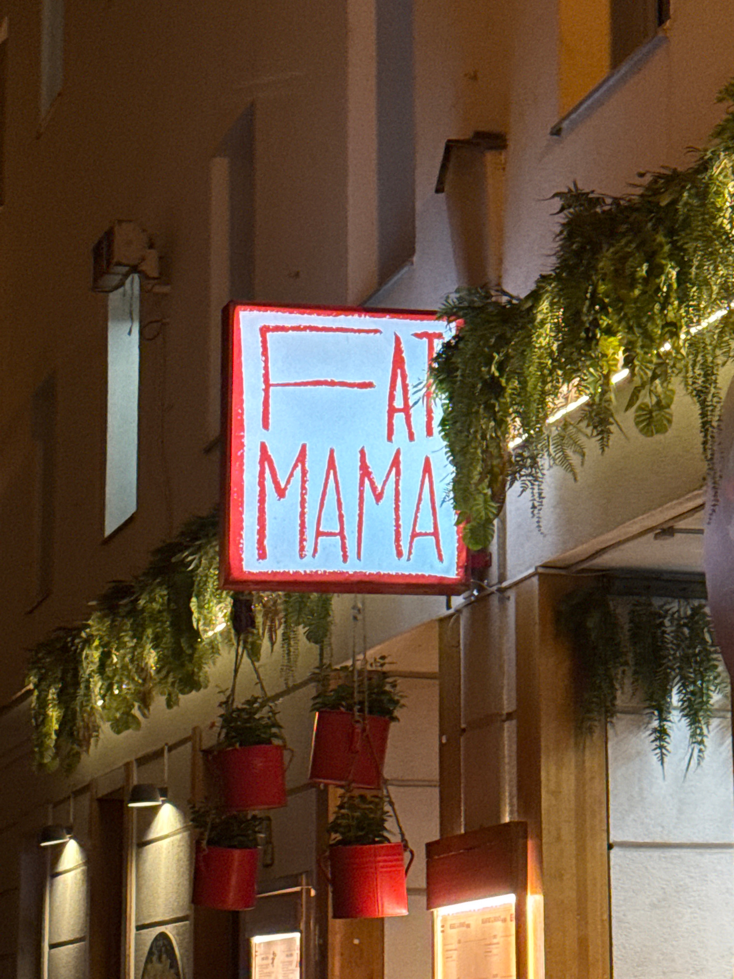 The image shows a square sign with the words "FAT MAMA" written vertically in red letters with a white border. The sign is hanging from a ceiling adorned with greenery, possibly garlands or hanging pl…read more