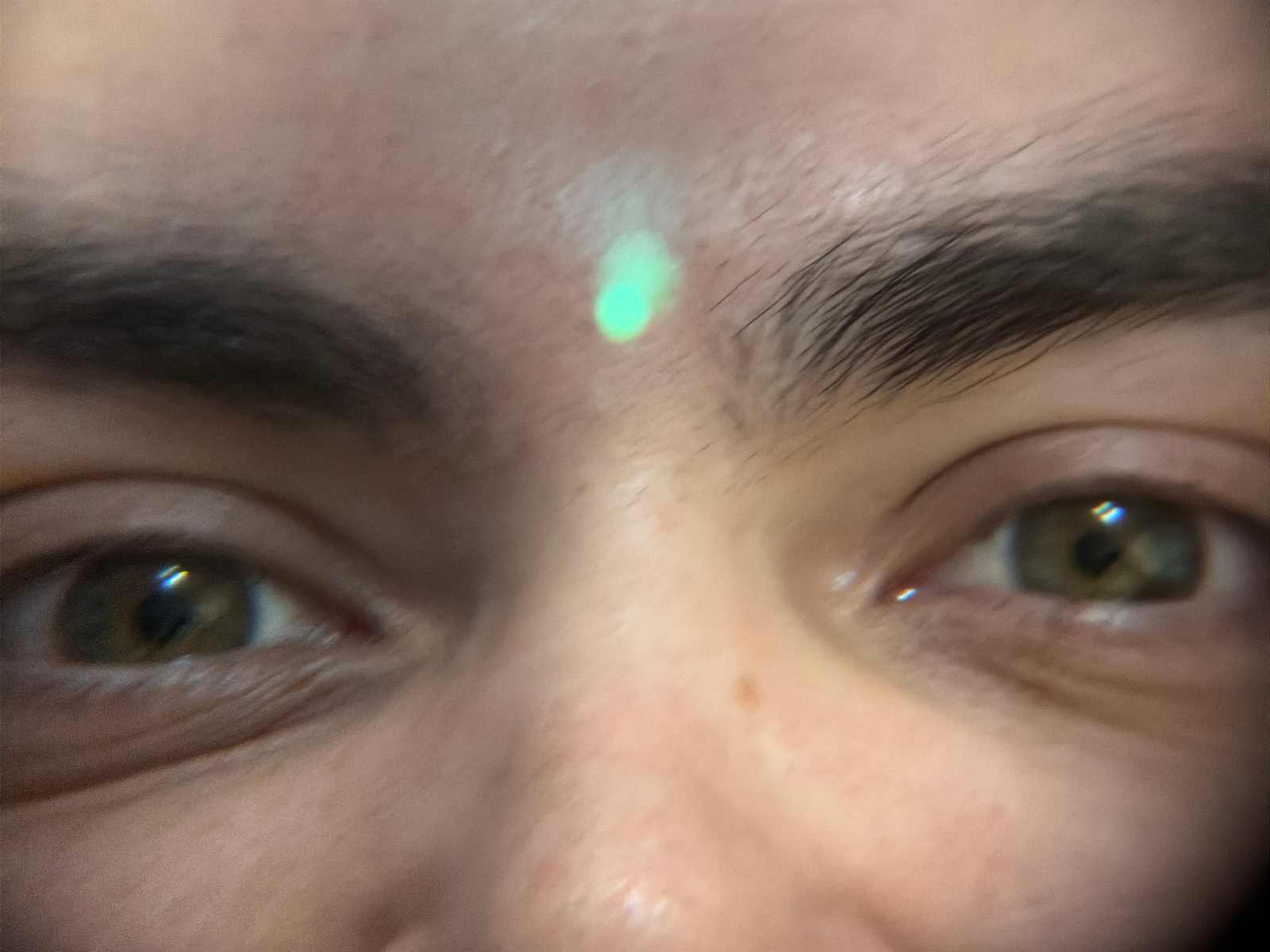 A close-up, blurred image shows a person's eyes, eyebrows, nose, and part of their forehead. The eyes are green. The eyebrows are dark and thick. A bright, somewhat amorphous green light is reflected…read more