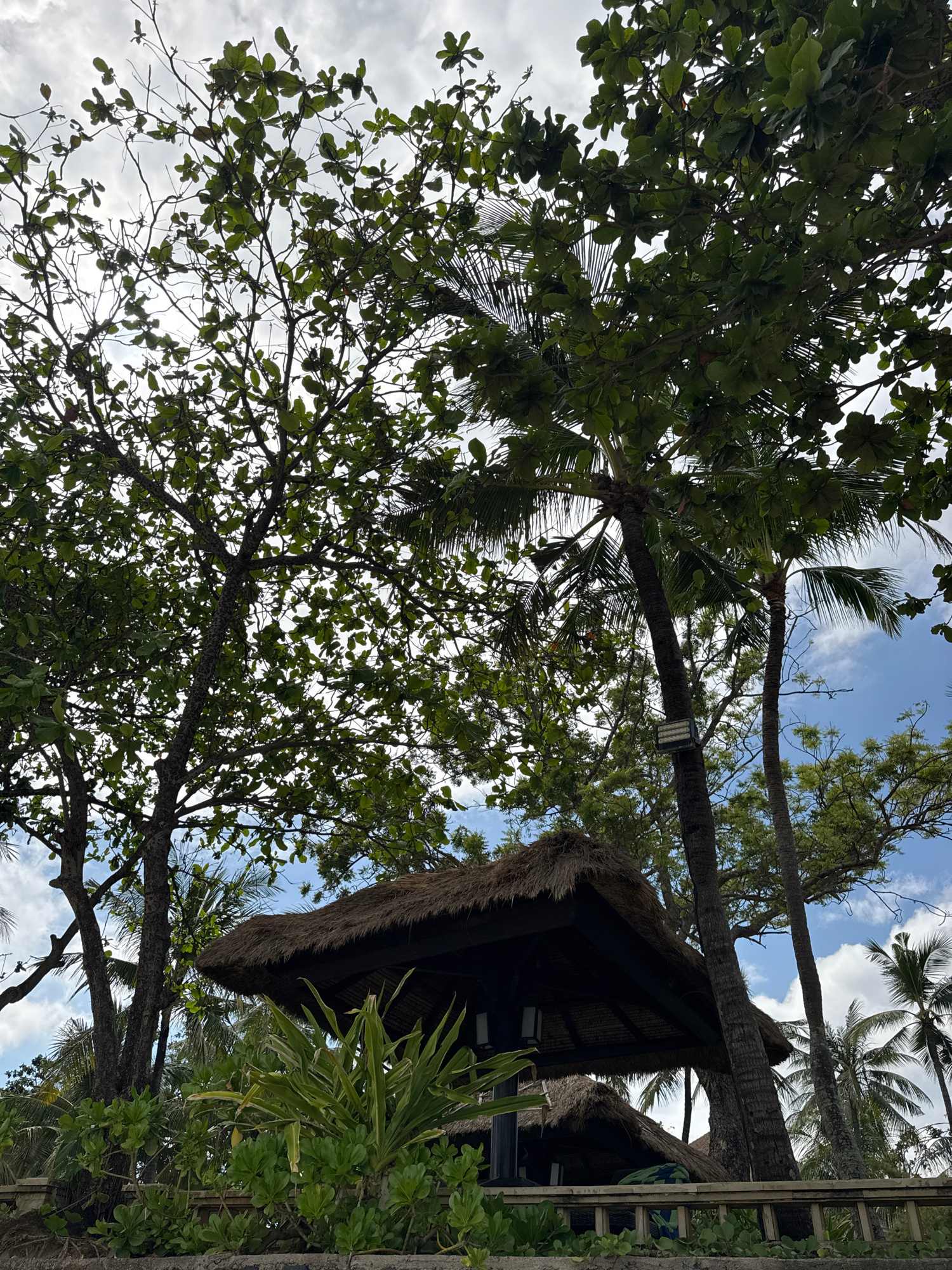 The image depicts a view upwards through trees and foliage in Kuta Selatan, Indonesia. Several palm trees are visible, with one prominently featuring a light fixture attached to its trunk. A thatched-…read more