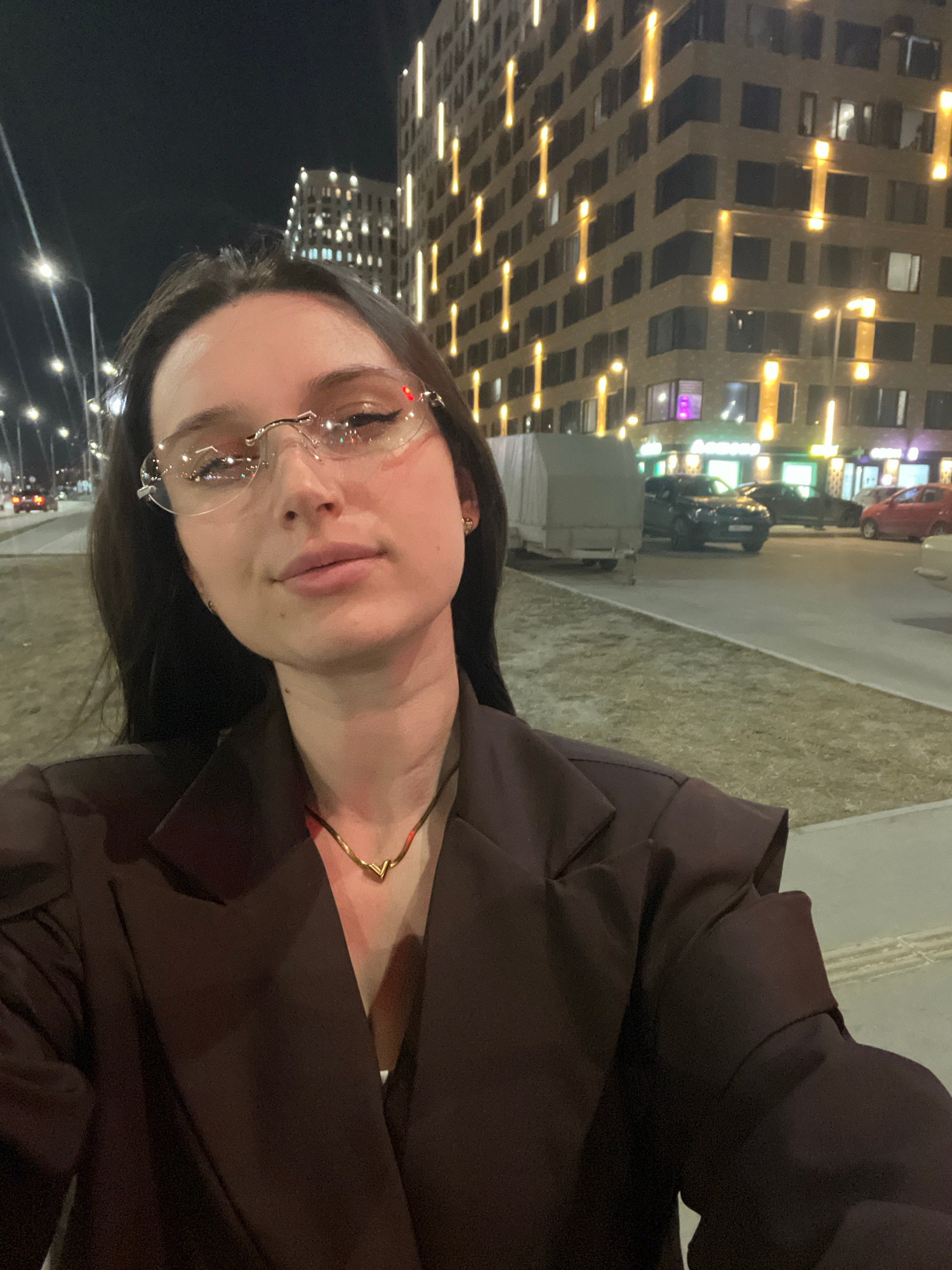 A woman is posing in a vertically oriented selfie shot at night on a city street. She is wearing glasses with clear, rimless frames and a dark brown blazer. A gold necklace is visible at her throat. I…read more