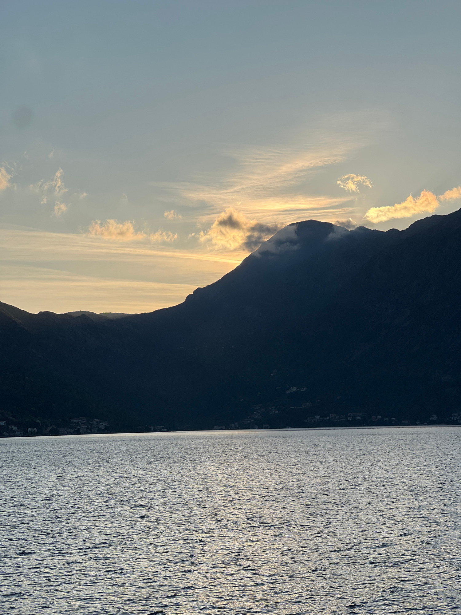 The image depicts a landscape in Perast, Montenegro at sunset. A dark mountain range dominates the center, casting a shadow over a narrow strip of land with sparsely scattered buildings. To the left,β¦read more