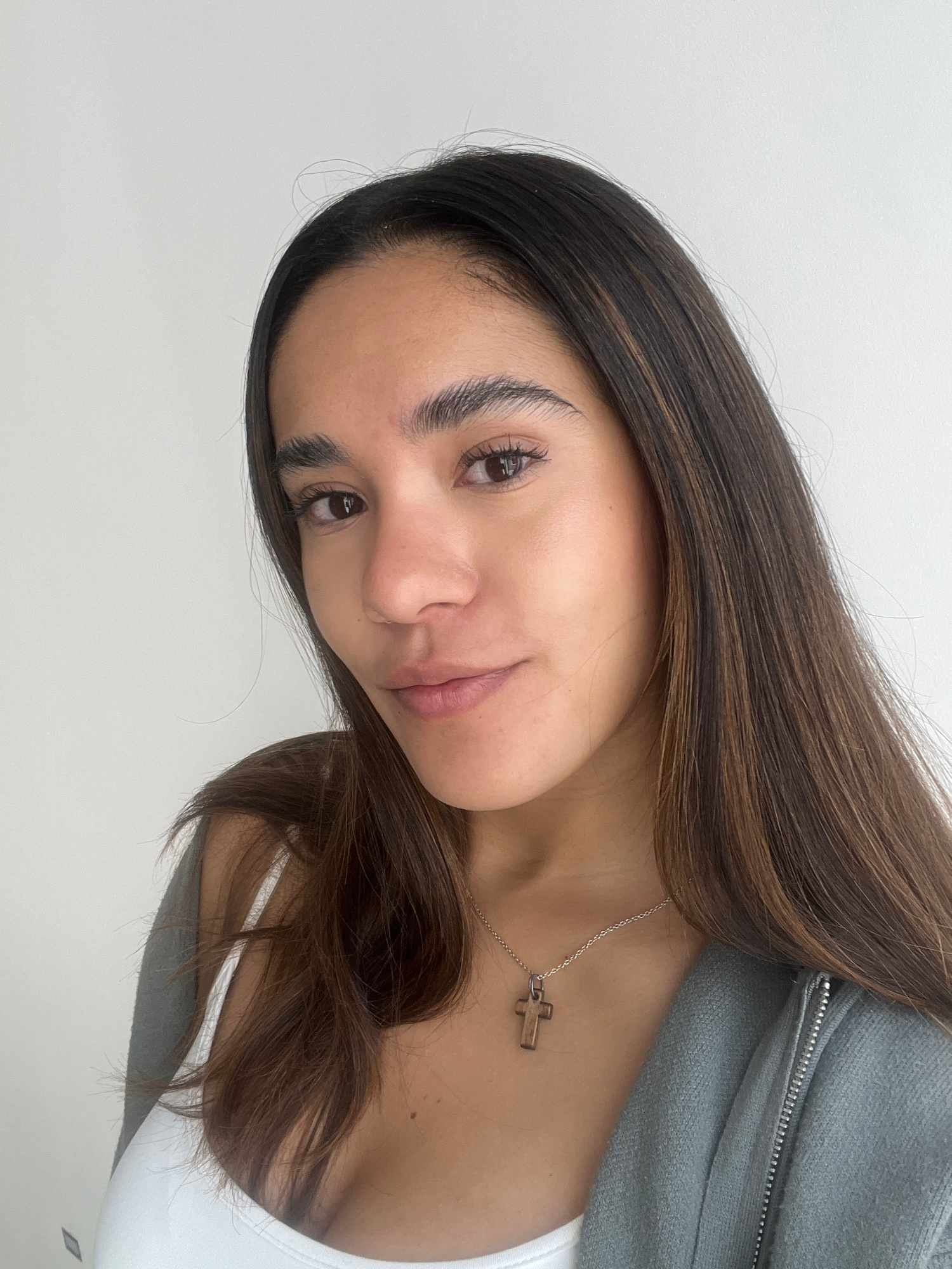 A woman is seen from the shoulders up, indoors against a light-colored wall. She has long, brown hair with highlights, and is wearing a white top and a gray zip-up hoodie. A silver necklace with a cro…read more