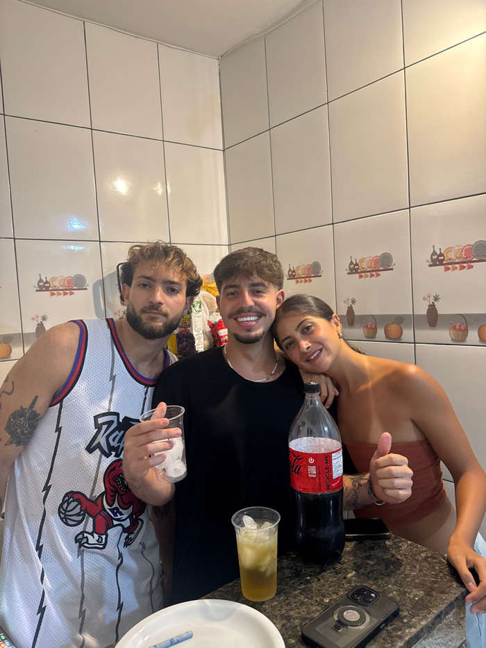 Three young adults pose closely together. One wears a white basketball jersey with a cartoon character on it. Another is wearing a black t-shirt and has a woman leaning onto their shoulder. She wears…read more