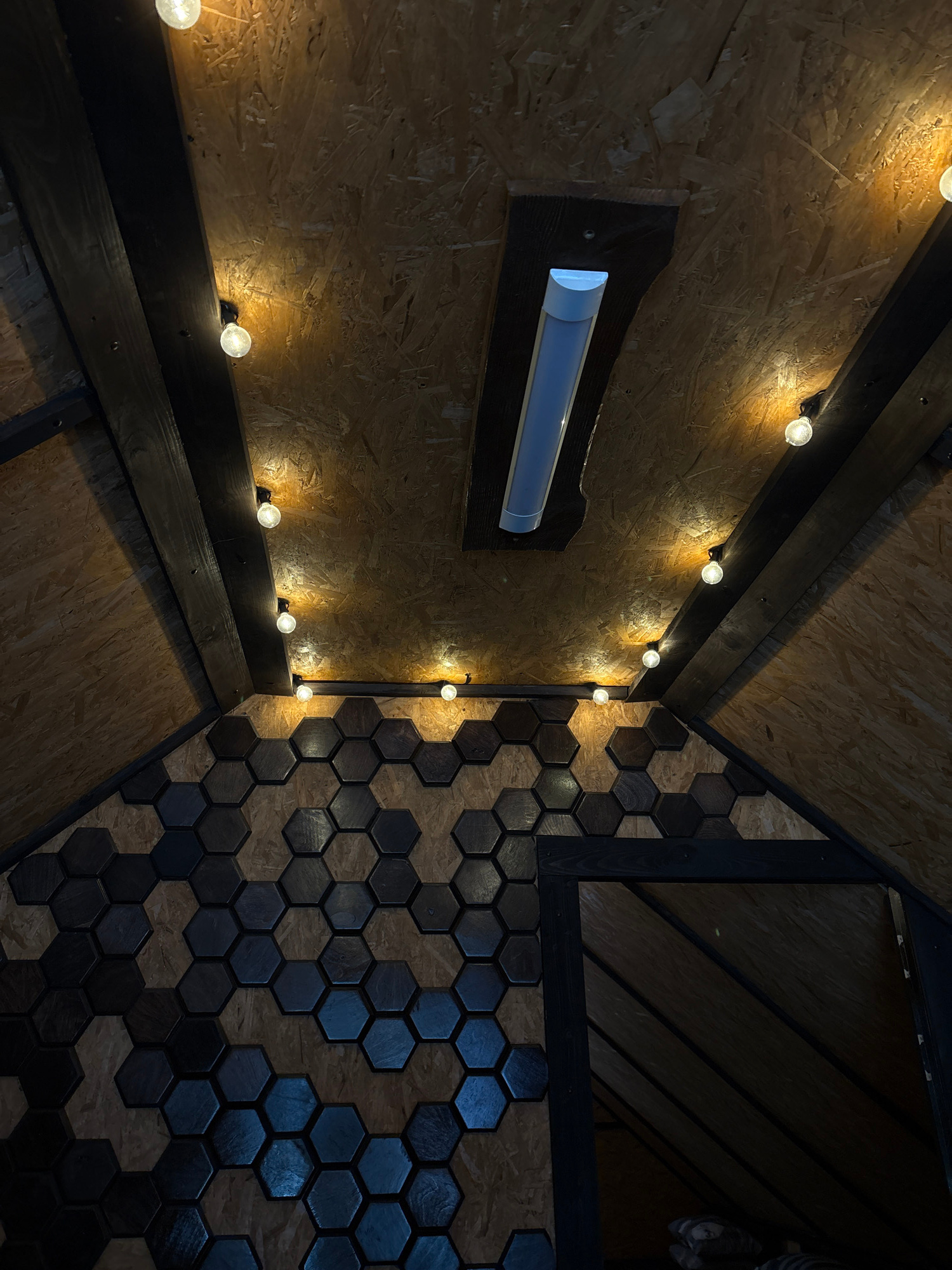 The image shows an interior with a combination of plywood and dark wood hexagon tiles. A string of globe lights runs along the plywood wall, near a rectangular fixture with a fluorescent tube. Dark wo…read more
