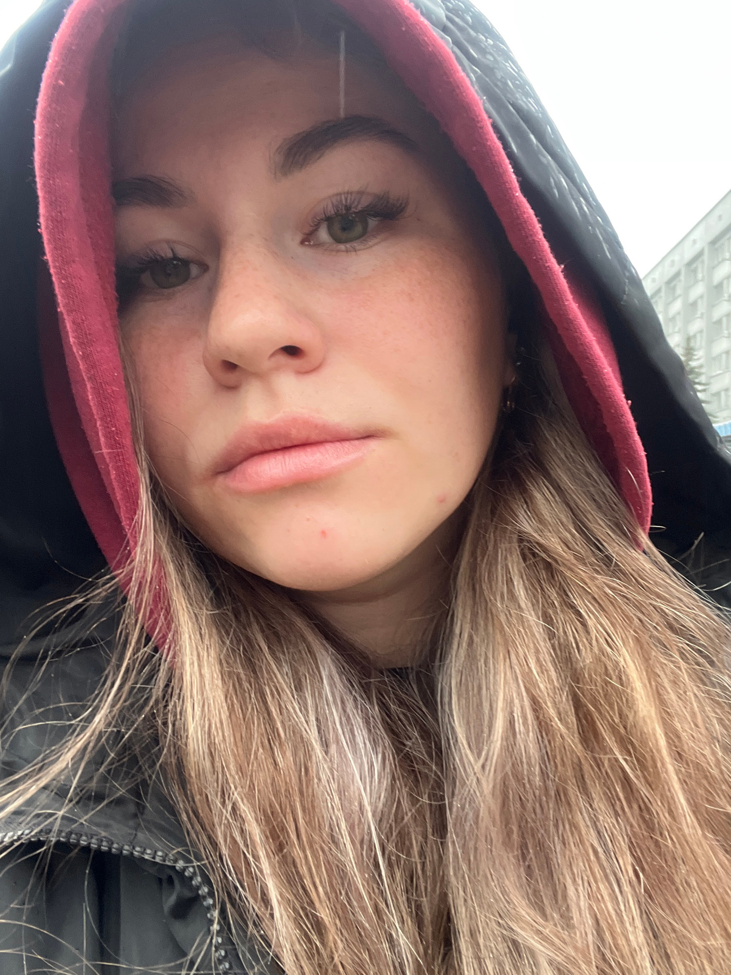 The image is a close-up, diagonal self-portrait of a young woman, captured outdoors. Her face, primarily her left side, occupies a significant portion of the frame, tilted with her gaze directed towar…read more